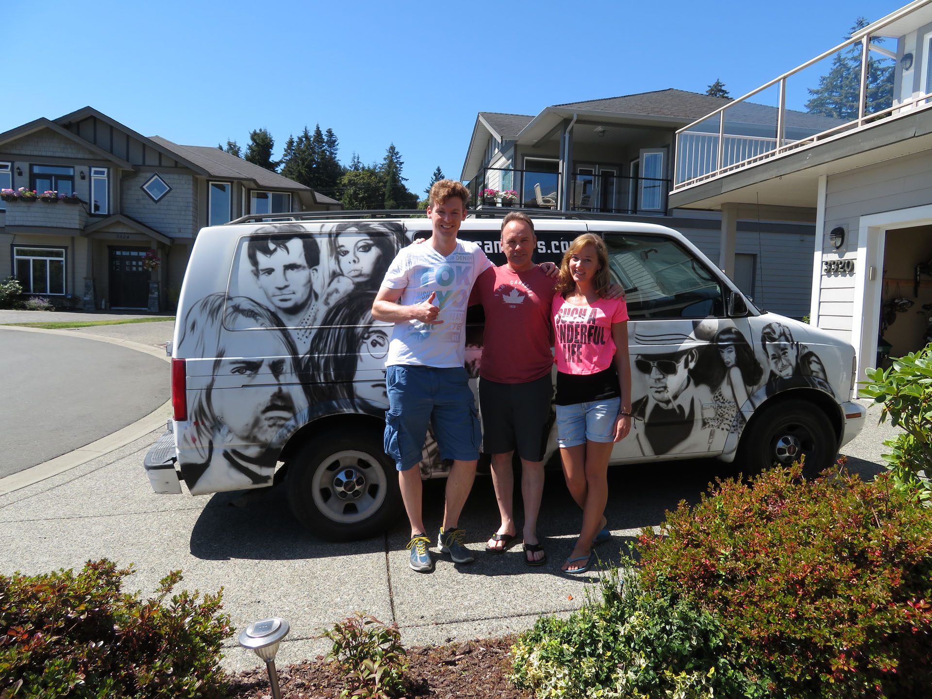 Gleich an jenem ersten Abend on the road bemerkten wir das Potential dieser Bemalung: die Leute gucken, machen Fotos und man kommt ständig ins Gespräch! „Na, habt ihr alle erkannt?“- „ja- die meisten… habt ihr das so bemalt?“ etc. In diesem Fall waren es Reg und sein Sohn Aaron, die uns diese Frage stellten. Reg kannte fast alle, und Aaron, der etwas geistig behindert und so Ende 20 war, war total begeistert von unserem Auto und löcherte seinen Vater, wer denn wer sei. Im Gespräch kam raus, dass die beiden gleich um die Ecke wohnten. Selbstverständlich ließ ich völlig arglos die Frage einfließen, wo wir uns denn angesichts der vielen Verbotsschilder seiner Meinung nach für die Nacht hinstellen könnten- und BINGO „im Zweifelsfall in meinen Driveway“! Dabei sollte es jedoch nicht bleiben- als wir ankamen führte uns Reg durch sein schickes Haus mit Meerblick: „hier ist das Gästezimmer, fühlt euch wie zuhause!“ Danke Reg, danke Idols- die erste Nacht im Van wird wohl warten müssen!