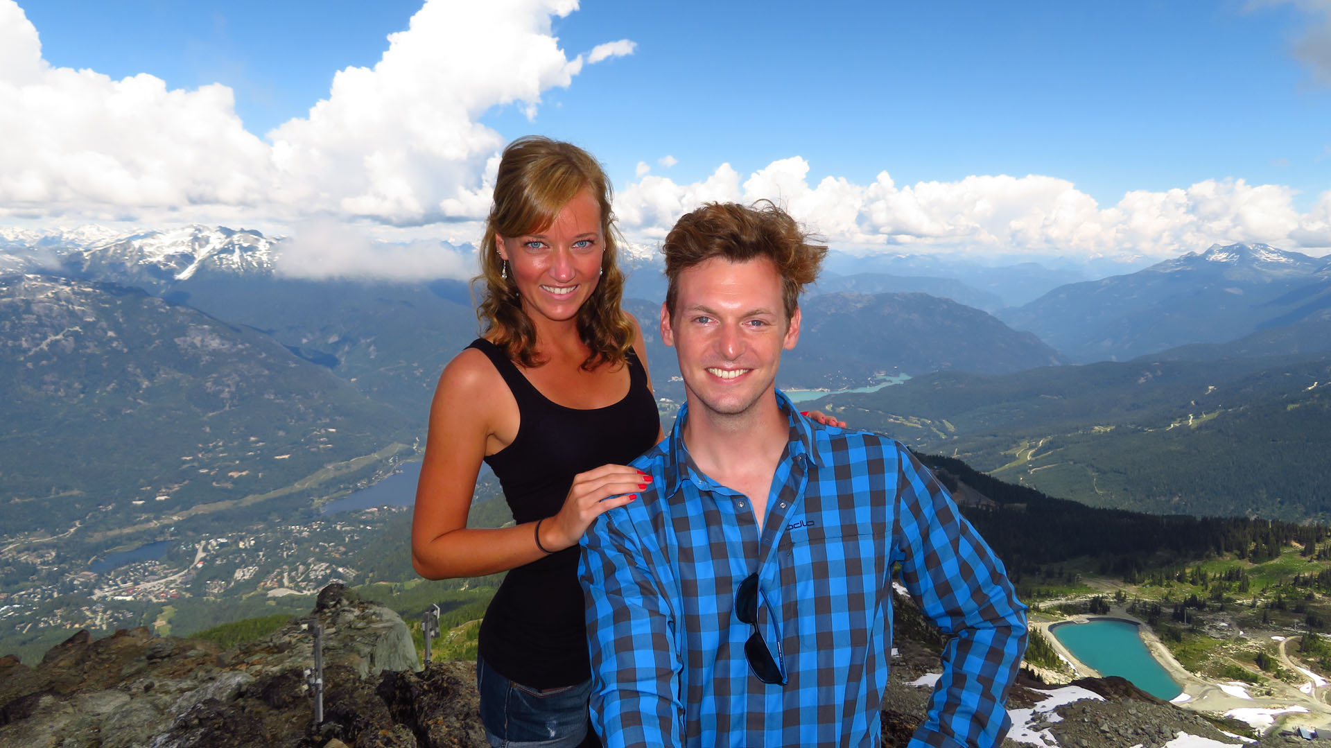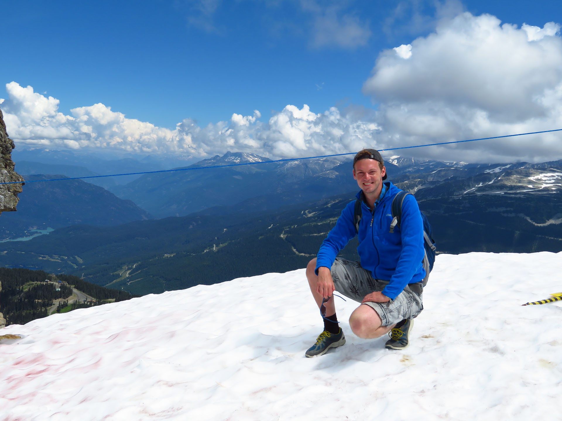 Da `lange Schlafen‘ +`viele Kilometer‘+`warten an der Fähre‘ nicht = Whistler ist, verbrachten wir die Nacht auf dem Weg dahin budgetschonend auf einem unbebauten Grundstück neben einem Autohaus. Whistler selbst ist ein Resort-Dorf, die Fußgängerzone ist also komplett designed und vollgestopft mit Geschäften und Restaurants, wobei die Hüttenpreise es hier durchaus bis ins Tal geschafft haben. Regungslos weidete sich die Dame an der Touristen-Info an unserm Schock, als wir uns nach den Preisen für die Gondelbahn erkundigten: 65 $- dafür kann man immerhin auch mal queren auf den Gipfel des Nachbarberges. Peak2Peak heißt die entsperchende Bahn, und sie hat sogar nen Glasboden. Den nächsten Tag verbrachten wir also in den Bergen, was wirklich sehr schön war! Wir hatten tolles Wetter und im beeindruckenden Panorama strahlten die schneebedeckten Gipfel in der Sonne.
