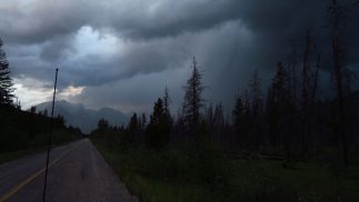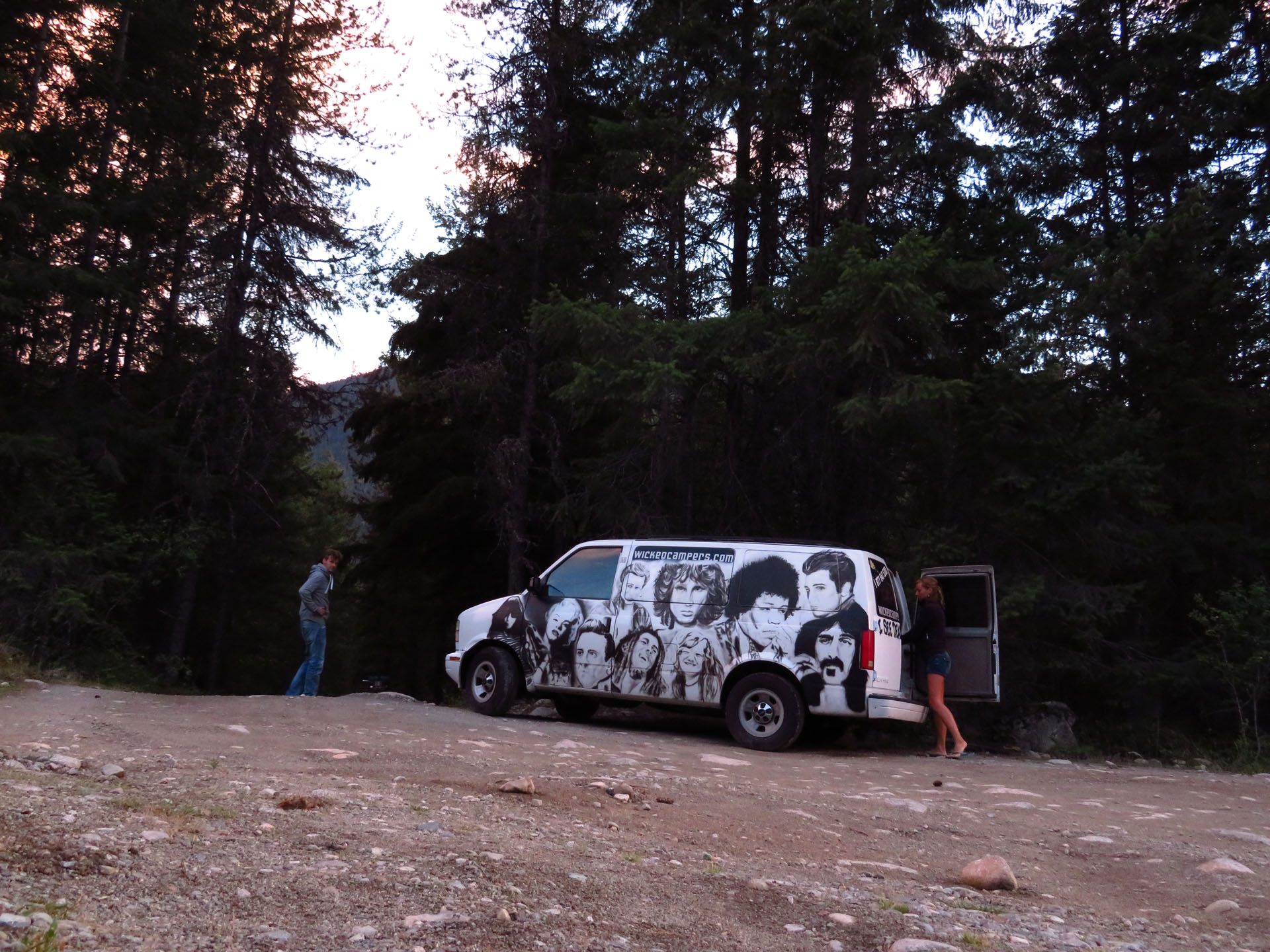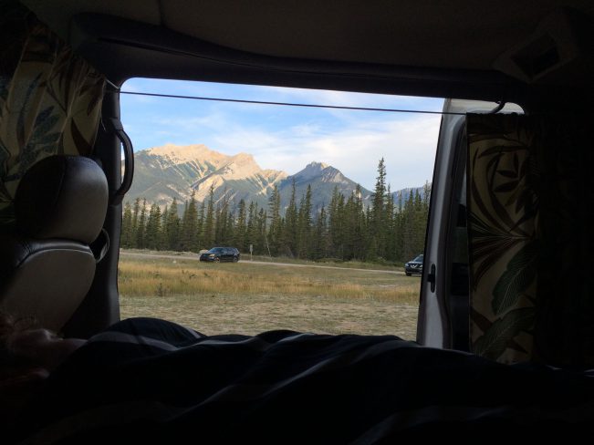 Angesichts der Größe des Landes, ist man mitunter geneigt, die Distanzen in Kanada zu unterschätzen. Um sich zwischen zwei „nah“ beieinander liegenden Punkten auf der Karte zu bewegen ist es schnell „mal eben“ a few hours drive. Da wir einen recht entspannten Tagesablauf pflegten und wir praktisch nie vor 11 Uhr abfahrbereit waren, mussten wir mal ein bisschen Strecke machen und verbrachten den nächsten Tag quasi komplett auf der Straße, um den Nationalparks in den Rocky Mountains mal etwas näher zu kommen. Für die Nacht suchten wir uns wiederum ein abgelegenes Plätzchen zum wild-campen und fanden den geradezu perfekten Platz. Rechts und links vom Highway ist außer Gegend meist nichts, nur hin und wieder windet sich eine Schotterstraße in die Hügel. Wir hatten uns auf dem Handy eine ausgeguckt, und mussten nach zwei, drei Kurven feststellen, dass sie immer schlechter und immer steiler wurde. Idols war alles andere als ein geländetaugliches Allradfahrzeug, wir beschlossen aber, ihm trotzdem eine Chance zu geben, denn der Weg schien prinzipiell durchaus vielversprechend zu sein. Im gleichmäßigen Schneckentempo trieb ich Idols also den Hang hoch auf den Hügel und dort wo der Weg ebener wurde gab es tatsächlich eine kleine Fläche neben dem Weg, auf dem das Auto sogar ziemlich grade stehen konnte. Was für eine Szenerie- Idols im Sonnenuntergang in der freien Wildbahn… so hatte ich mir das vorgestellt! Da es recht warm war ließen wir später zunächst die Seitentür auf. Während ich so wegdämmerte raunte mir Dori plötzlich alarmiert zu: „da ist irgendwas!!“ Sofort war ich im Bärenalarm- das wäre schlecht!! Ich lag zudem unmittelbar neben der offenen Tür- geradezu lächerlich leichte Beute für einen hungrigen Grizzly! Ein Leuchten mit der Lampe, es raschelt… schnell schloss ich die Tür – phu, in Sicherheit. Oder doch nicht? Mit der Lampe wollte ich einen Blick durch das Fenster der Beifahrertür werfen- welches –oha- sperrangelweit offen stand, ebenso wie das der Fahrertür…! Wo war gleich der Schlüssel…? Ein professioneller Bär hätte wohl längst zwischen uns gelegen, bis wir die Karre dann mal wirklich verrammelt hatten. Trotzdem war da was- Dori meinte sogar, einen Mann im weißen T-Shirt gesehen zu haben … wir werden es nicht erfahren.