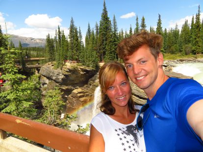 Gleich am ersten Tag in Jasper kam es zu einer höchst unwahrscheinlichen Begegnung! Während ich auf der Suche nach einem Liqour-Store (denn selbst das Feierabendbier ist so böse, dass es nicht nur nicht ohne ID, sondern auch nicht im Supermarkt verkauft wird) in Jasper über die Straße ging wunderte ich mich: ‚was grinst mich dieser Typ so übertrieben an, und warum geht der mir nicht aus dem Weg?!‘, bis mir einen Moment später klarwurde: das ist mein Kumpel Alex!! Studienfreund und Ex-Kollege! Verrückte Welt. Wie sich herausstellte waren er und seine Freundin Lisa auf einer ganz ähnlichen Route unterwegs wie wir- nur mit etwas mehr Zeitdruck und mit Zelt! Wir konnten es kaum fassen und malten uns aus, dass wir uns bestimmt schon das ein oder andere Mal nur knapp verpasst hatten! Tatsächlich hat Alex unseren Van wohl später nochmal auf dem Highway gesehen…