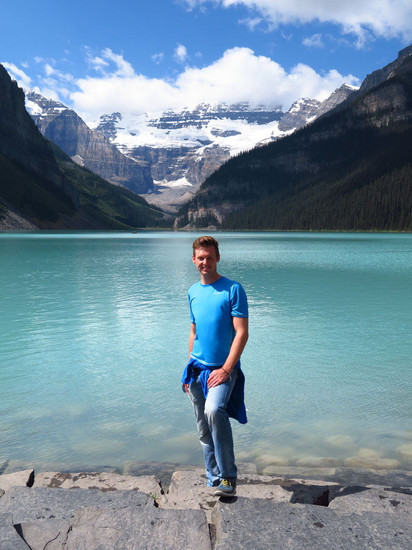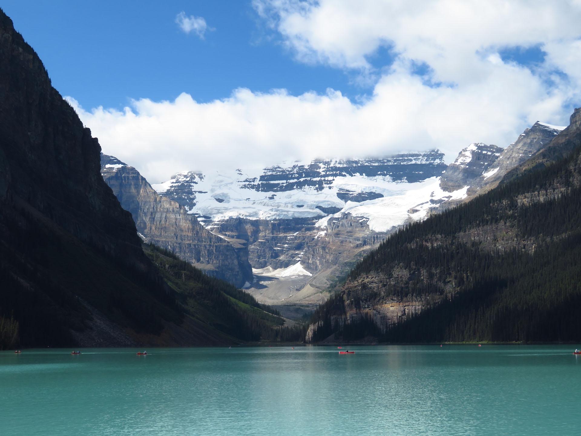 Absoluter touristischer Brennpunkt im Banff Nationalpark ist das Örtchen Lake Louise, quasi Gateway zum gleichnamigen See, der eines der wohl bekanntesten Postkartenmotive der Region darstellt. Direkt am See liegt ein großes Luxushotel, welches aus der Zeit stammt, als dank dem Bau der Eisenbahn die Rocky Mountains als Touristenziel erschlossen wurden. Wir hatten uns – hochmotiviert und entgegen unserer Gewohnheit- vorgenommen, früh aufzustehen, um noch vor 9:00 Uhr auf dem Parkplatz zu sein.  Dies war, wie wir erfuhren, der kritische Zeitpunkt, wo dieser wegen Überfüllung geschlossen wurde. Morgens war jedoch graues Nebelwetter und wir beschlossen, dass sich das Opfer des frühen Aufstehens nicht lohnen würde und blieben liegen. Ein Fehler! Zügig klarte es auf, und als wir unseren Entschluss revidierten war es bereits zu spät und es kam wie es kommen musste: lange Schlangen, viele Autos und nur weil wir uns noch auf dem Ausweichparkplatz vors Klohäuschen quetschten kamen wir überhaupt noch unter…