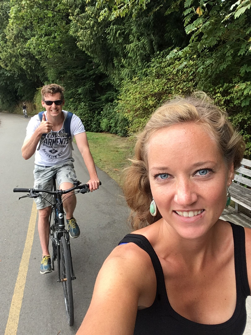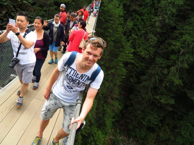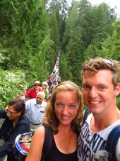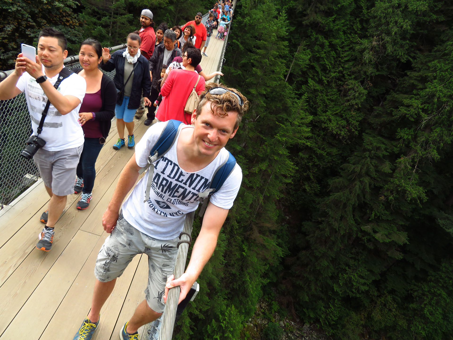 An unserem letzten gemeinsamen Tag strahlte noch einmal die Sonne, daher nutzen wir das schöne Wetter und mieteten uns Fahrräder. Wir umrundeten den Stanley Park, der von drei Seiten von Wasser umgeben ist, und machten uns dann schließlich über die große Brücke auf Richtung Norden, zur Capilano Suspension Bridge, einer der längsten frei schwingenden Hängebrücken des Universums. Nach dem schweißtreibenden Anstieg fragten wir uns, ob das ganze wohl Eintritt kosten sollte, da es offenbar in eine Art Park eingebettet war. Wie viel sollte das schon sein, um so eine Brücke zu überqueren – 5…6 Dollar? Oder halt 35. Plus tax versteht sich. Was solls- wir sind jetzt nicht umsonst den Berg hochgeradelt! Also Augen zu und durch. Der Park war schon nett gemacht! Neben der in der Tat eindrucksvollen Hängebrücke gab es einen Spazierweg auf Brücken zwischen den hohen Bäumen und einen ‚Cliff Walk‘ bei dem man einen halbkreisförmigen Weg über eine Steilwand hinaus laufen konnte. Insgesamt also ein schön angelegter Park, der seine 6$ durchaus wert gewesen wäre!