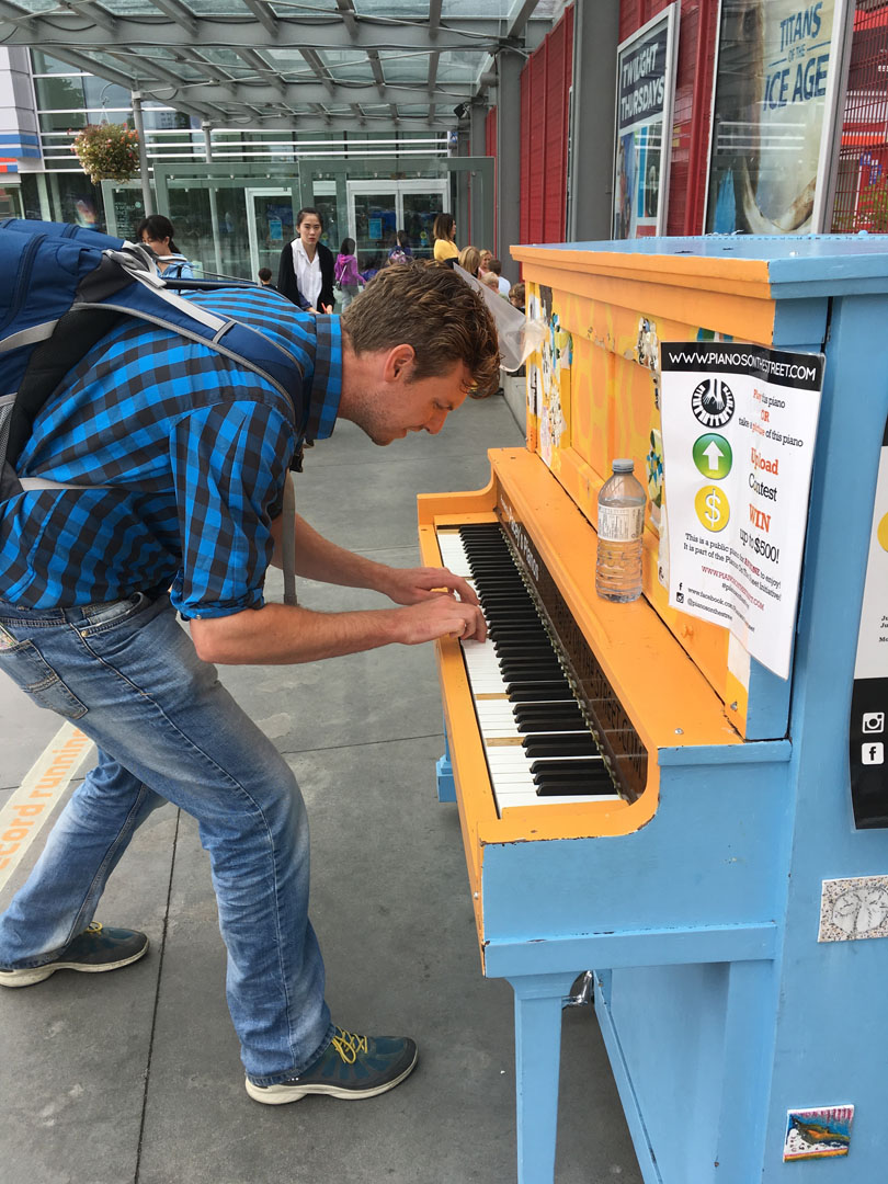 Vancouver selbst begrüßte uns erst mal mit Nieselregen, so dass wir bei unsrer ersten Erkundungstour durch die Stadt nur erahnen konnten, warum es als die tollste Stadt Kanadas gilt. Ein Grund dürfte die Lage am Wasser sein- weitläufige Jachthäfen, Inselchen wie Granville Island bestimmen das maritime Flair der Stadt. Eine große Brücke spannt sich- ähnlich wie in San Francisco- über die Bucht zum nördlichen Teil der Stadt. Wir machten eine kleine Rundfahrt durch den Hafen in einem geradezu winzigen Taxibötchen und fuhren mit dem Seabus nach North Vancouver, von wo aus wir einen tollen Blick auf Downtown hatten. Auch in Vancouver gibt es ‚public pianos‘ und wir haben auch mal ein kleines Ständchen mit Gesang gegeben… schon ne schöne Sache! Es macht Spaß, im Vorbeigehen ein wenig zu klimpern, oder anderen, womöglich professionelleren Spielern zuzuhören.