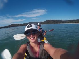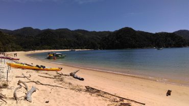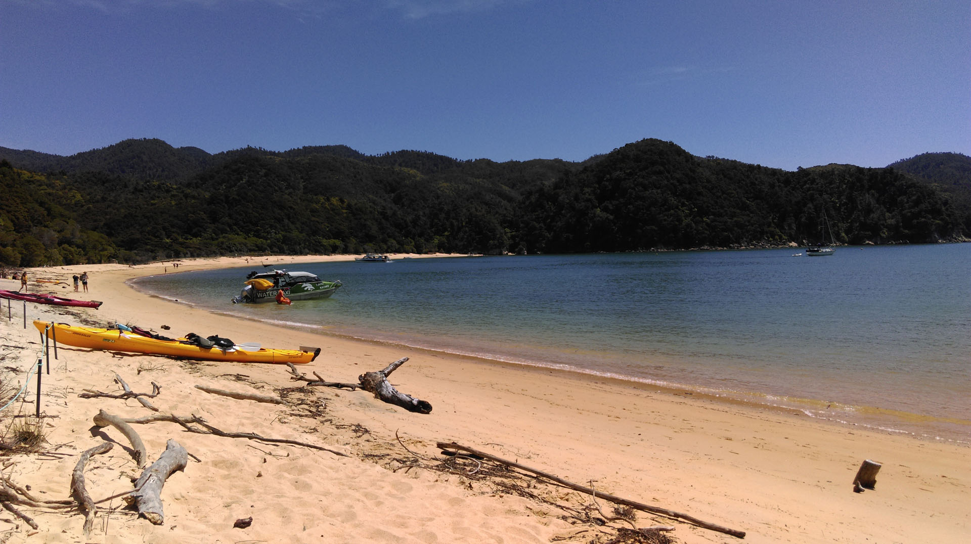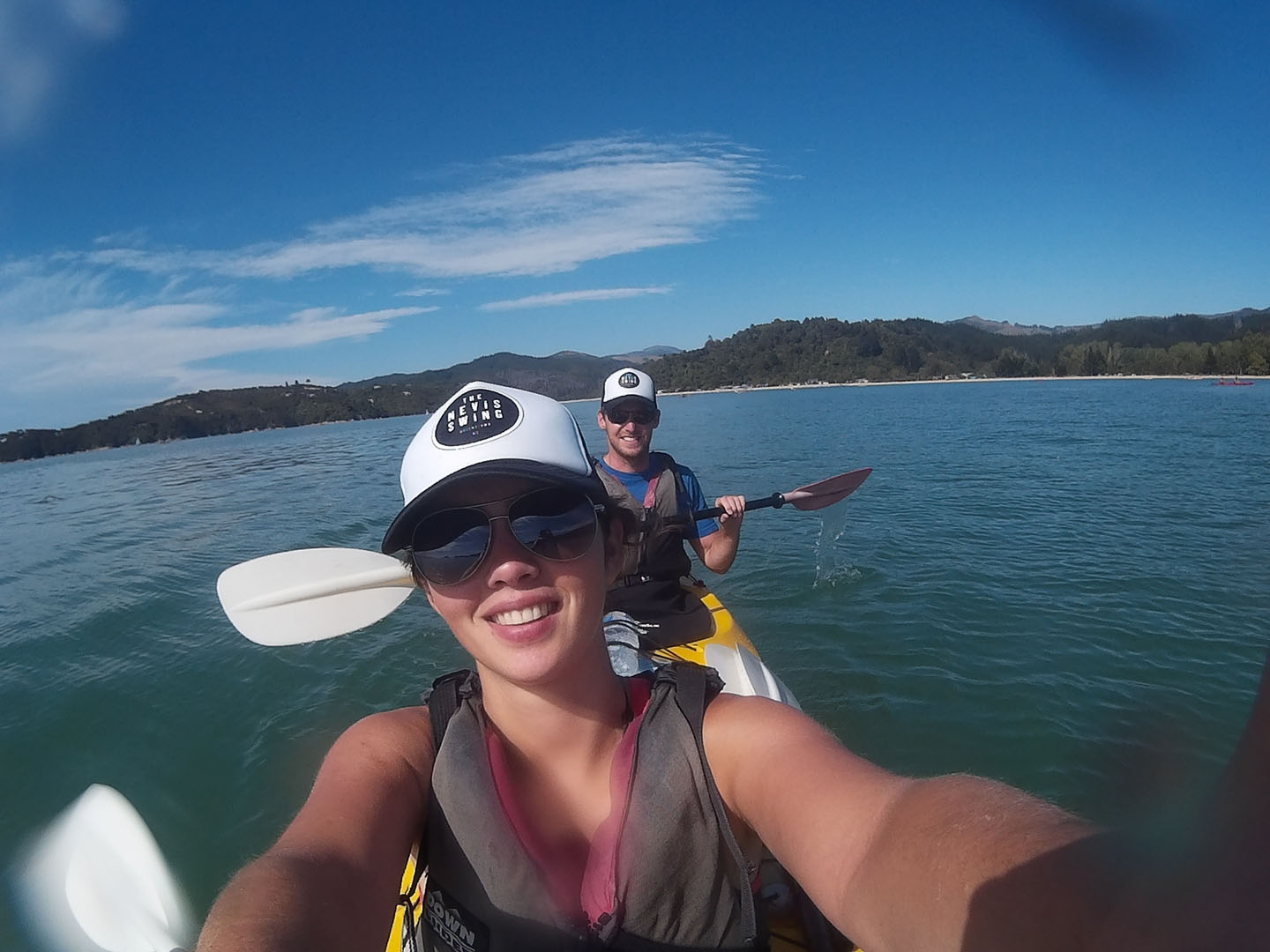 Nicht verpassen durfte man natürlich auch die obligatorische Kajaktour an der Küste des Abel Tasman Nationalparks. Gegen eine geringe Gebühr hatten wir eine selfguided Tour gebucht und paddelten mit einem ziemlich professionellen Doppelkajak inklusive dieser Schürze gegen das Spritzwasser durchaus mit sportlichem Ehrgeiz die Küste hoch. Schließlich wollten wir von Marahau bis zur Anchorage Bay kommen, und unterwegs gab es ja auch noch einiges zu entdecken. Für den Weg zurück hatten wir dann gar nicht mal so viel Zeit übrig, daher mussten wir uns nochmal richtig in die Riemen legen!