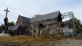 Wo wir schon mal da waren, wollte ich natürlich auch mal Christchurch sehen, auch wenn Neuseeland eher wegen seiner Natur als wegen seiner Städte zu bereisen ist. Mehr als ein kurzer Bummel war allerdings nicht nötig. Die Stadt an sich ist ein zweckmäßiges Schachbrett und größere Sehenswürdigkeiten fehlen. Außerdem hat sie sich immer noch nicht von dem großen Erdbeben 2011 erholt, das ihr heftig zugesetzt hatte. Damals wurden etliche Gebäude beschädigt, zahllose weitere mussten als einsturzgefährdet gelten, da sich die Bodenstruktur verändert hatte, und viele Menschen starben. Am deutlichsten gezeichnet ist die Christchurch Cathedral, die unbenutzbar und abgesperrt ist, und in deren Seite ein großes Loch klafft. Dadurch, dass das Wetter bedeckt und drückend war, war die Atmosphäre insgesamt schon reichlich trist.