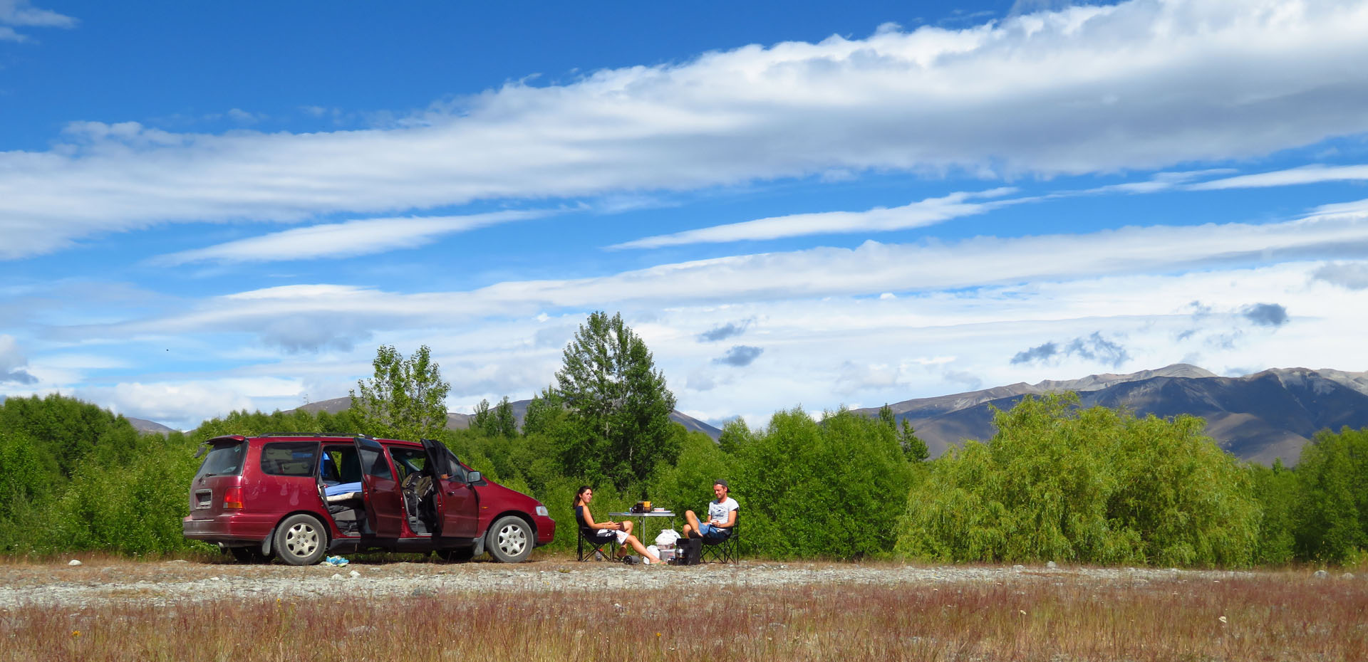 Christina aus Mainz, die ich gut zwei Monate vorher auf den Cookinseln kennengelernt hatte, war ebenfalls auf einem Working Holiday Visum hier. Den verregneten Winter hatte sie in Tauranga verbracht, und war nun schon seit ein paar Wochen kreuz und quer auf der Nordinsel unterwegs gewesen. Nachdem schon Freunde und Geschwister mit ihr mitgefahren waren, war ich nun der neue Travelmate für die Südinsel und einen weiteren Loop durch den Norden. Sie nannte einen mittelmäßig abgerockten Honda Odyssee ihr eigen- wie ich später erfuhr, neben dem Toyota Estima DAS klassische Backpackerauto in Neuseeland.