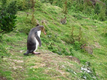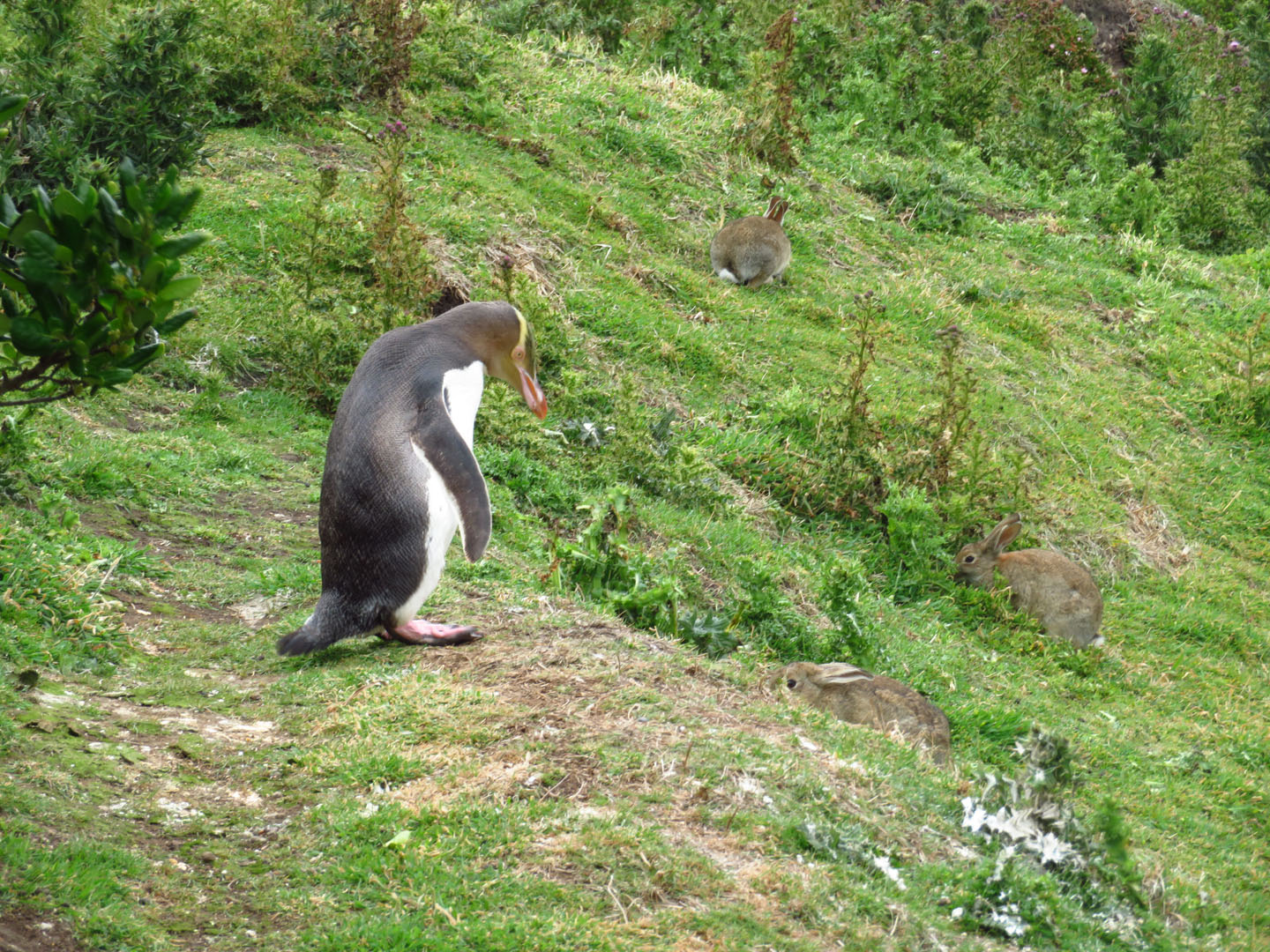 Dann aber ging der Roadtrip los, und ich bekam den ersten Eindruck von der vielgestaltigen Landschaft. Über hügelige Küstenlinien bewegten wir uns Richtung Süden, eine der ersten Attraktionen war die abendliche Heimkehr der kleinen Zwergpinguine in ihre Höhlen unter den Felsbrocken des Piers bei Timaru, die wir uns im Nieselregen betrachteten- goldig, da man nicht blitzen durfte, ist die Qualität der Bilder jedoch überschaubar.