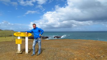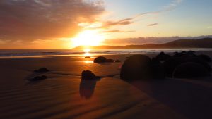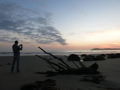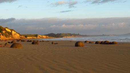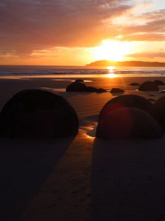 Ein bekanntes Fotomotiv sind die „Moeraki Boulders“, eine Reihe von erstaunlich runden Felskugeln, die bei Ebbe aus dem Sand schauen. Wie Christina leider gehört hatte, sollte der Sonnenaufgang der Szenerie angeblich eine ganz besondere Dramatik verleihen, und so fand ich mich anderntags mit Jacke und Pulli – und tatsächlich ein paar anderen Schaulustigen – im Morgengrauen am Strand wieder und jagte das perfekte Foto. Und in der Tat, das frühe Aufstehen hatte sich doch gelohnt: