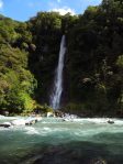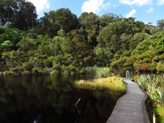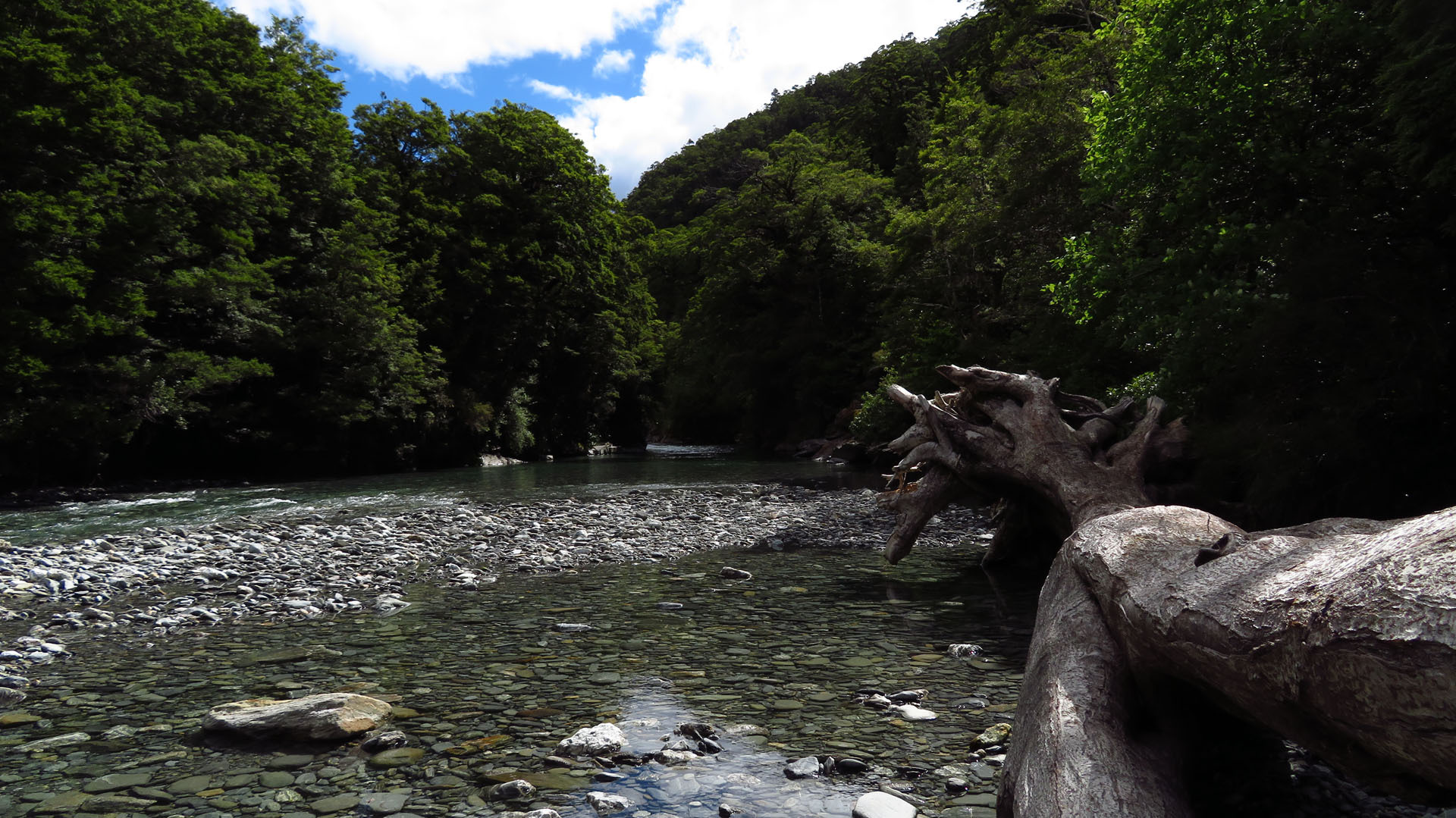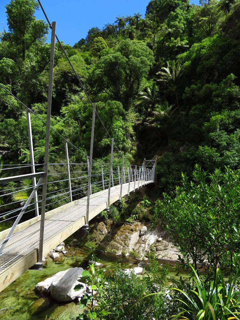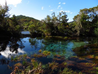 Durchs Inland fuhren wir weiter zur Tasman Bay und erkundeten die Gegend in und um den beiden Nationalparks „Kahurangi“ und „Abel Tasman“. Absolut sehenswert waren hier die „Te Waikoropupu Springs“, eine den Maori heilige Quelle, wo aus dem Boden ein Fluss entspringt. Leider ist der Ort derart heilig, dass baden verboten ist, ja nicht einmal die Berührung des Wassers ist gestattet! Mit Macht drückt das Wasser von unten in den kleinen See, der deshalb immer in Bewegung ist und ein wenig aussieht als liefe eine starke Umwälzpumpe. Das Wasser ist absolut glasklar und herrlich blau und der Anblick würde zum verweilen einladen, gäbe es nicht so viele Sandflies, die einen fressen wollen!