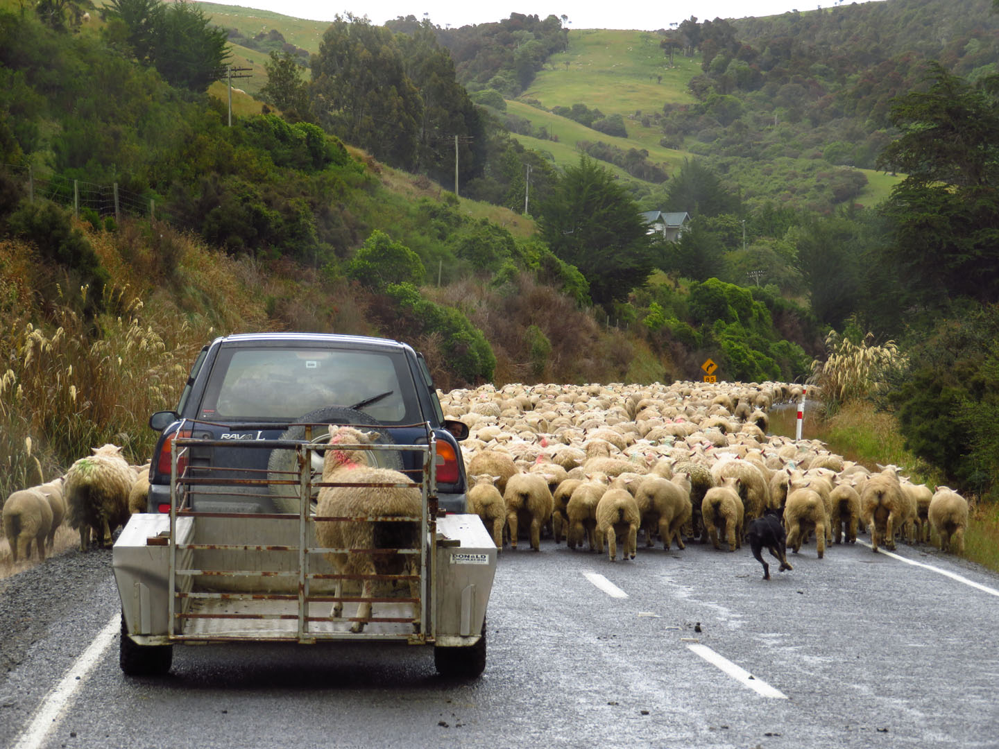 Weiter ging es Richtung Süden, denn unser nächstes Etappenziel war der südlichste Punkt Neuseelands (zumindest des Festlandes). Unterwegs wurden wir einmal aufgehalten, da eine Schafherde ein Stück über die Straße getrieben werden musste- und Schafe gibt es hier eine Menge! Mit runden 30 Millionen ein vielfaches mehr als Menschen, denn Neuseeland hat tatsächlich nur etwa 5 Millionen Einwohner, und somit etwa so viele wie Sydney. Mit einer Anzahl von 159000 pro Jahr fallen die Backpacker da durchaus ins Gewicht.