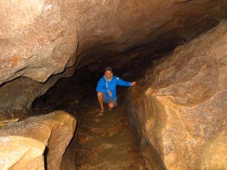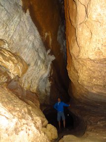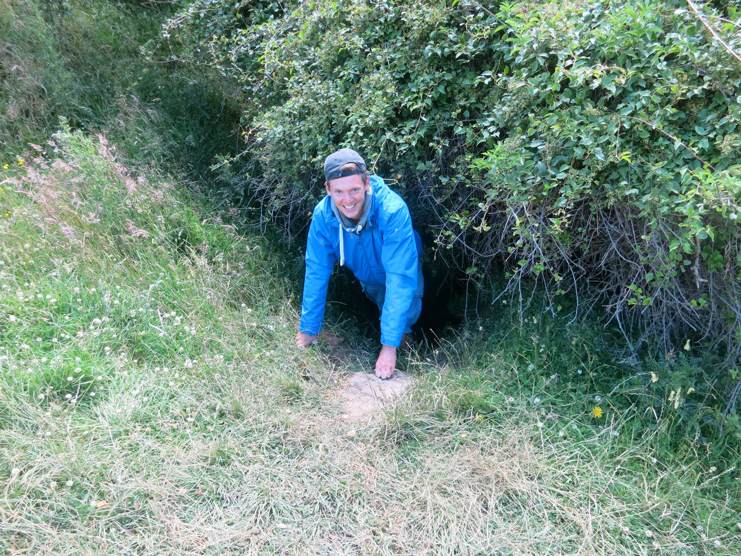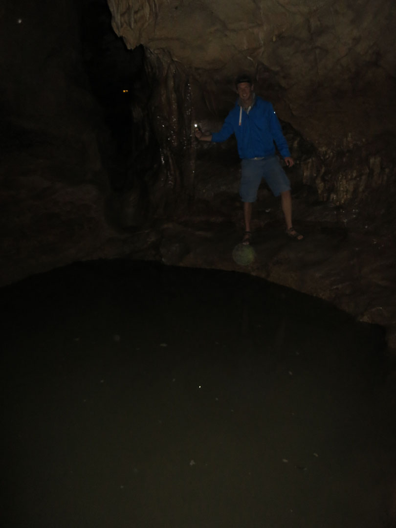 Ab und zu trafen wir in der Höhle auf andere Leute, einmal auch welche die uns entgegen kamen und einen anderen Eingang genommen hatten. Eigentlich den Ausgang auf der Vorgeschlagenen Route, von dem wir gewusst hätten, hätten wir das Schild gelesen. Also weiter! Kleiner Abtörner war jedoch, dass Christinas Taschenlampe mittlerweile nur noch ein schwaches Glimmen von sich gab, und ich mich – analog zu meinen Höhlenexkursionen in Hawai’i – wieder nur mit der kleinen Handylampe wiederfand, deren trübes Licht also mal wieder das einzige war was uns von ewiger Finsternis trennte…! Das Terrain wurde jetzt auch etwas abenteuerlicher: mal eine Leiter hoch, dann wieder eine Leiter runter, schließlich ein grauer Teich zu dem man durch einen schmalen Spalt herunter stieg, und um den nur ein abschüssiges kleines Sims herumführte. Mit nur einer Handylampe für beide gar nicht so einfach, da man beide Hände zum klettern braucht, sich aber eigentlich nicht gegenseitig leuchten kann, da man um die Kurve muss. Trotz schrecklicher Visionen, dass das Handy in den ungewissen Tiefen des Tümpels verschwinden könnte schafften wir es auch über diese Stelle hinweg und kletterten schließlich durch ein noch unscheinbareres Loch im Hügel wieder ins Freie. Was für ein tolles Abenteuer! Und überdies noch völlig kostenlos!