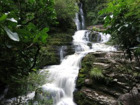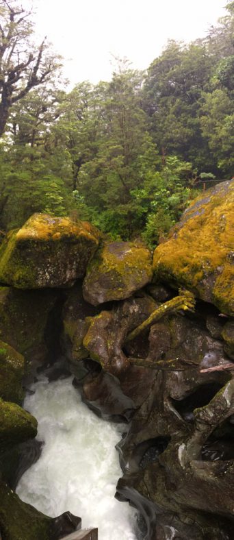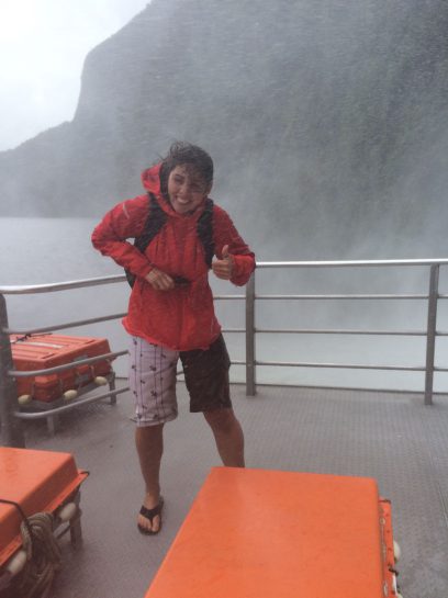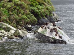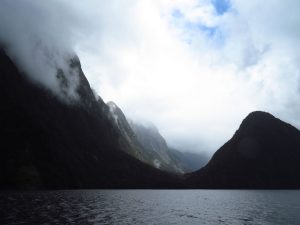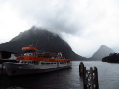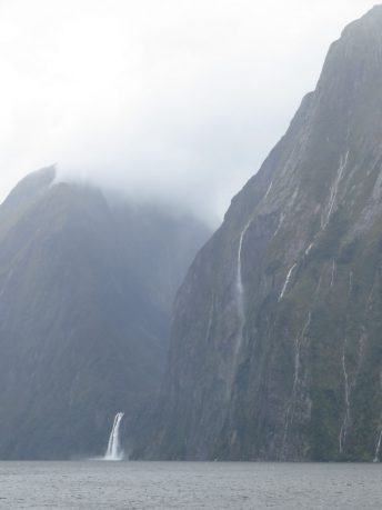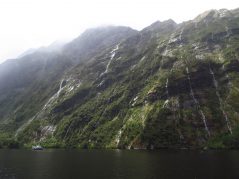 Der nächste Stopp war die Stadt Te Anau, die ein Gateway zum Milford Sound ist, dem bekanntesten Fjord Neuseelands. Für den folgenden Tag hatten wir eine Bootstour gebucht- zu einem guten Preis über das Schnäppchenportal „Bookme“. Die Westküste der Südinsel ist insbesondere im Südwesten vom Wetter häufig eher rau, und auch für unseren Trip sah die Prognose alles andere als rosig aus. Generell sagten uns alle Kiwis immer wieder, was für einen ausnehmend schlechten Sommer wir erwischt hätten, und dass das Wetter im Großen und Ganzen völlig untypisch wäre für diese Jahreszeit… half uns jetzt auch nur bedingt weiter! Der Milford Sound selbst liegt ziemlich isoliert und es gibt weder Handyempfang noch Benzin sondern im Grunde nur die Bootstation- und die liegt runde eindreiviertelstunden von Te Anau weg. Unsere Tour sollte um 12 Uhr starten und während wir näher an die Fjorde kamen wurde das Wetter immer schlechter und der leichte Nieselregen spitzte sich mit Auffahrt auf den Parkplatz zu einem ausgewachsenen Platzregen zu. Etwas ratlos starrten wir auf die Sturzbäche an der Scheibe- so würden wir bereits auf dem Weg zum Terminal bis auf die Knochen durchweicht sein! Doch etwas Zeit war noch- und tatsächlich: um 20 vor zwölf schaltete Petrus auf Sprühregen zurück und die Tour konnte beginnen! Mit unserem Ausflugsboot schipperten wir Richtung Ozean- vorbei an mächtigen Wasserfällen, die sich ins Meer ergießen und steilen Felswänden, die sich senkrecht aus dem Wasser erheben. Unterdessen hatte es sogar aufgehört zu regnen und auch wenn blauer Himmel und Sonne schön gewesen wären- durch den vielen Regen bot sich ein ganz besonderes Bild: überall an den steilen Felswänden gab es Rinnsale und kleine Wasserfälle, in denen das Wasser den Hang herablief, und wenn sich wirklich mal ein Fetzen blauer Himmel und ein paar Sonnenstrahlen zeigten, glitzerten die nassen Felsen im Licht. Auf einem Felsen lagen ein paar Seehunde, und wenn man genau hinsah konnte man sogar einen kleinen Pinguin entdecken. Auf dem Rückweg fuhr der Skipper das Boot einmal ganz nah an einen Wasserfall heran, so dass das Deck einmal in tosende Gischt getaucht war. Mit complimentary Fish and Chips verzogen wir uns schließlich bei neuerlich einsetzendem Nieselregen unter Deck und waren sehr zufrieden, dass in den entscheidenden Momenten das Wetterglück auf unserer Seite gewesen war!