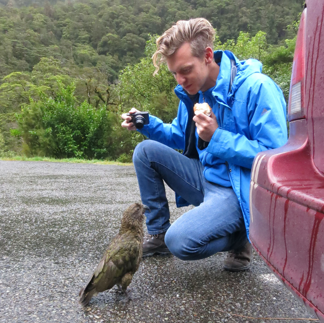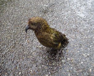 Auf dem Rückweg hielten wir noch an einer engen ausgewaschenen Schlucht, durch die ein Wasserfall rauschte und machten auf dem Parkplatz Bekanntschaft mit den seltenen Keas, den neuseeländischen Bergpapageien. Diese bedrohten Vögel sollte man auf keinen Fall füttern, aber ihr Verhalten legte nahe, dass sich wohl die wenigsten an diese Regel halten! Fährt ein neues Auto auf dem Parkplatz vor kommen die neugierigen Keas zügig an gehüpft und checkten erst mal die Fütterungsoptionen ab. Ich hatte ein Stück Brot im Mund – wohl gemerkt zum selber essen- doch der Kea hoffte, ich würde wohl teilen wollen. Ich hockte mich hin um ein Foto von ihm zu machen, und um seinem Anliegen etwas Nachdruck zu verleihen tippte mich der Papagei ein paar Mal sachte mit dem Schnabel aufs Knie und sah mich erwartungsvoll an. Als klar war, dass ich nicht vor hatte zu teilen hüpfte er rüber zu einem neu eintreffenden Auto mit Asiaten, die ihn unter großem Hallo freimütig fütterten…
