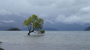 Um die Stimmung zu bessern gingen wir erst mal was essen und suchten dann den „Wanaka Tree“ auf – einen Baum der (warum auch immer) im Wasser steht, und ein beliebtes Fotomotiv ist. Mäßig spektakulär, aber gut- angesichts des nasskalten Wetters gingen uns hier jetzt auch etwas die Sehenswürdigkeiten aus.