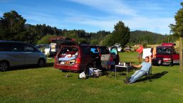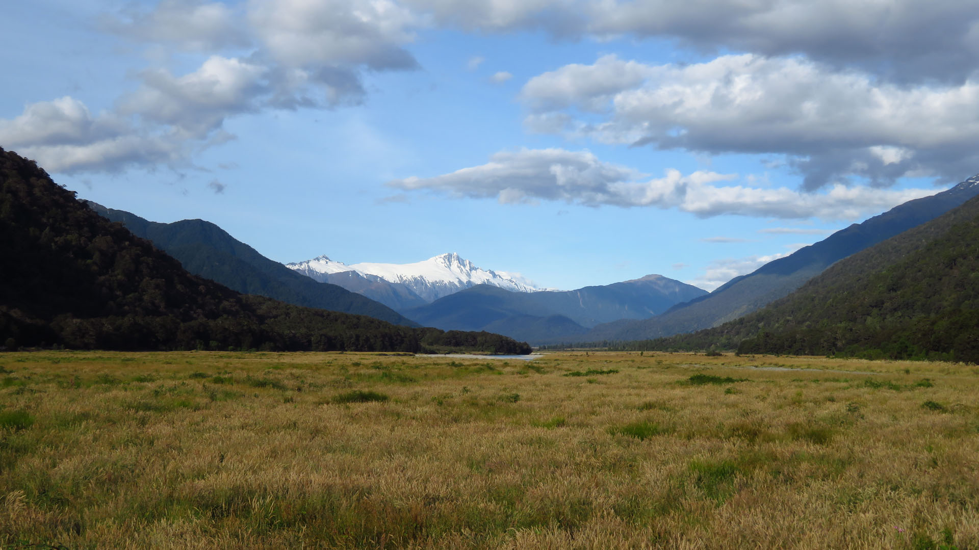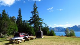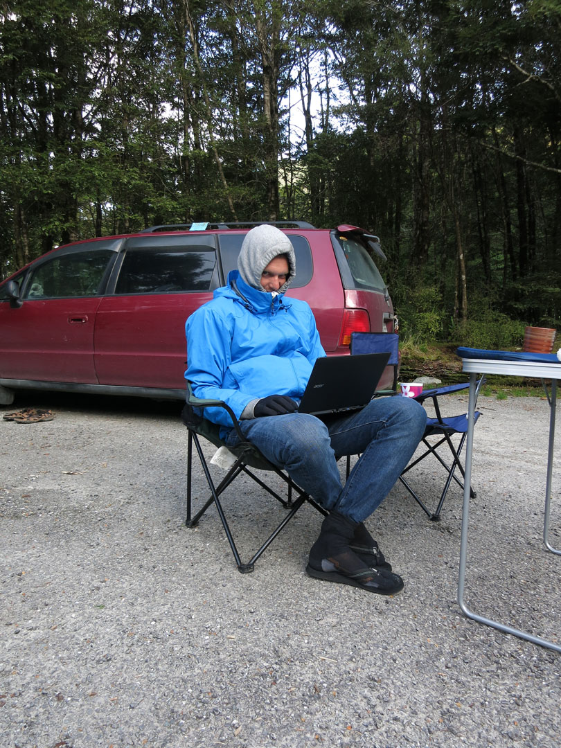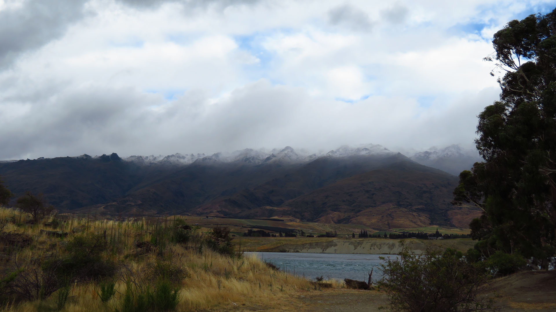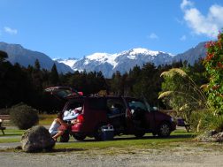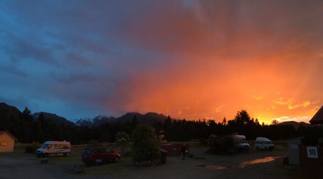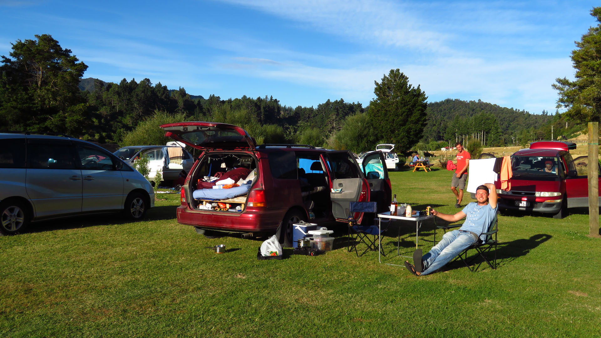 Neuseeland ist ein Land der Kontraste, und während wir uns nachmittags nach der Wanderung dick angezogen an unserem Tee wärmten, war auf unserem kostenlosen Campingplatz – wieder etwas außerhalb der Berge – ein paar Stunden später ein lauer Sommerabend angesagt. Zum Frühstück ließen wir uns dann die Sonne auf den Pelz brennen.
