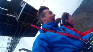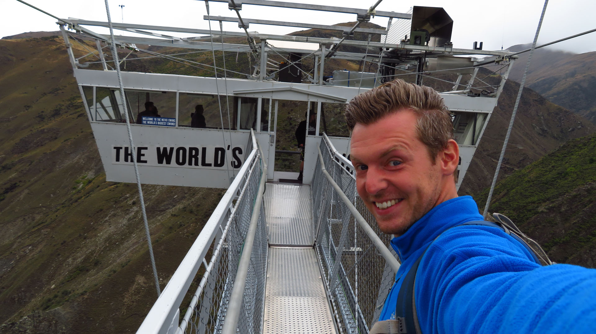 Heute war es dann schließlich soweit- unser Ritt auf der sagenhaften Nevis Swing, der größten Canyon-Swing der Welt stand an. Für ein stattliches Sümmchen hatten wir uns gegen Mittag einen Slot gesichert und mussten zunächst mal zur Check-In Prozedur zurück nach Queenstown. Selbstverständlich waren keine Parkmöglichkeiten seitens des Veranstalters zu erwarten- gibt ja `n Parkhaus gleich um die Ecke… is klar! Natürlich: voll. Um weitere Frustration zu vermeiden steuerten wir diesmal direkt unseren Parkplatz vom letzten Mal an und liefen wieder in die Stadt. So langsam stieg die Spannung! Einmal wiegen bitte- Gewicht und gebuchtes Produkt wurden mit Edding auf den Handrücken vermerkt- konnte ja jetzt eigentlich nichts mehr schiefgehen! Mit einem Shuttlebus fuhren wir eine Dreiviertelstunde zur eigentlichen Anlage: quer über ein Tal war eine Drahtseilkonstruktion gespannt, die ersten Meter ausgebaut als Hängebücke bis man in einer Art Gondel ankam. Hier wurden wir mit Sicherheitsgurten versorgt und schließlich in die eigentliche Schaukel eingeklinkt. Vor uns waren noch ein paar andere dran, was einem genug Zeit lässt, die Verrücktheit dessen was bevorstand noch einmal auf sich wirken zu lassen! Der besondere Kick an der Sache war, dass man im Grunde erst mal 70m frei fiel, bis man schließlich durch die Seile im Bogen über die Schlucht geführt wurde! Schließlich waren wir an der Reihe. Einmal eingeklinkt wurde man ein Stück nach vorne über den Abgrund gefahren. Seitens des Veranstalters wurde natürlich alles gefilmt, daher einmal winken nach hier, einmal lächeln nach da, dann kann‘s im Grunde genommen losgehen. Christina nannte ein günstiges GoPro Plagiat ihr Eigen, von deren letztgültiger actiontauglichkeit sie zwar nicht restlos überzeugt war, selbstverständlich hatten wir sie aber mal mitgenommen, außerdem filmte uns ein Mädel von der Gondel aus mit meiner Kamera.