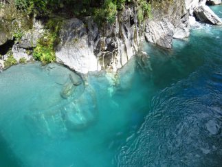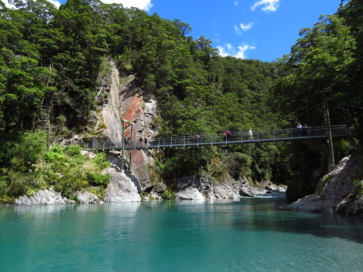 Eine Attraktion auf diesem Weg verdient jedoch besondere Beachtung: die Blue Pools! Hier fließt ein Gletscherwasser-Bach in ein anderes Flüsschen und bildet an einer Stelle ein tiefes Bassin, über das eine Hängebrücke führt. Unterhalb davon besteht das Ufer aus vielen Kieseln und rundgeschliffenen Steinen, oberhalb der Brücke kommt der Bach aus einer schmalen Schlucht. Wir hatten an dem Tag wunderbar warmes, sonniges Wetter, und die Blue Pools zeigten sich in aller Schönheit türkis-blau. Das Wasser war bestialisch kalt- so kalt, dass man nach 30 Sekunden barfuß drin stehen erst mal wieder `rausstieg, da die Füße brannten.