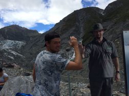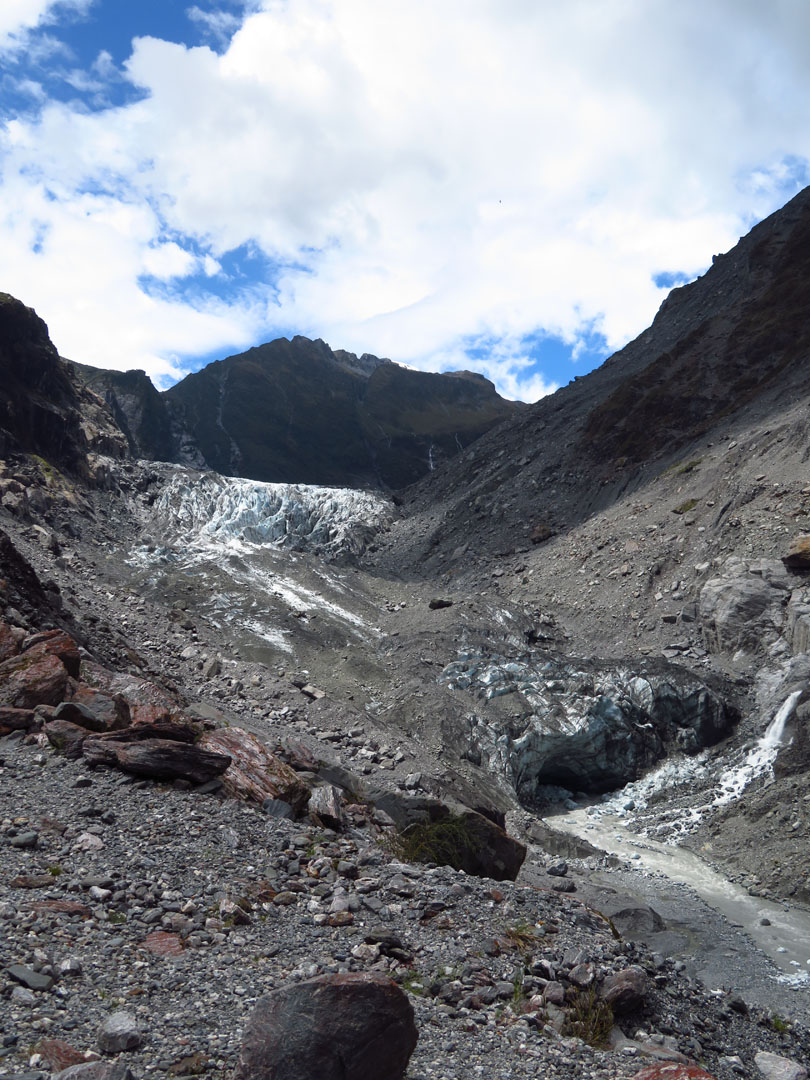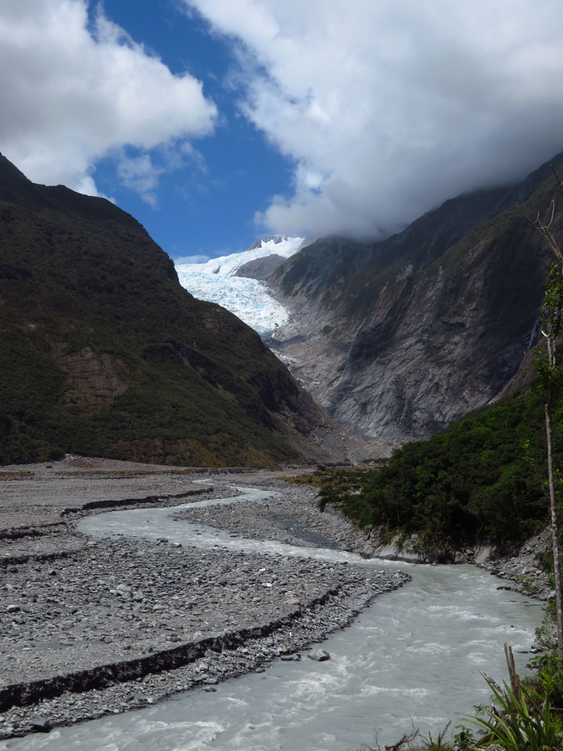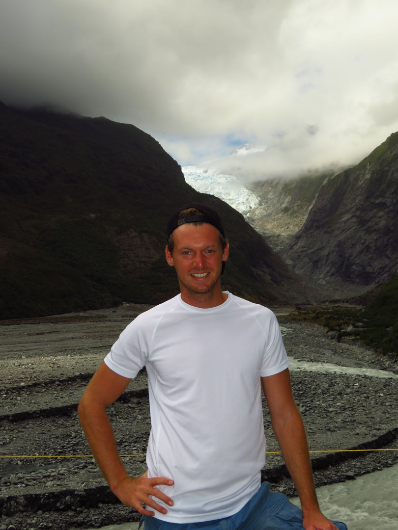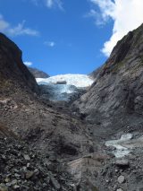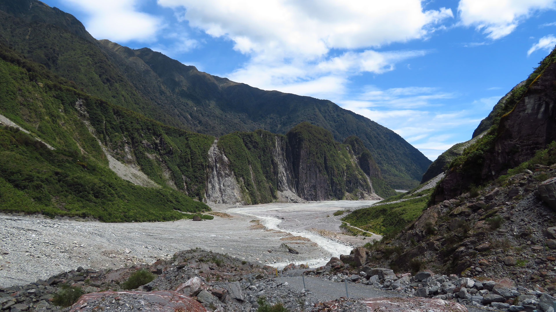 Der erste Gletscher, den man von Süden aus erreicht, ist der Fox-Glacier. Die Bergkette der Alpen verläuft unweit der Küstenlinie, und so ist es nur ein kleiner Schlenker weg vom Ufer, und schon ist man im Gebirge. Im Laufe der Jahre hat sich der Fox-Glacier ziemlich weit zurückgezogen, und ein entsprechendes Tal hinterlassen. Da ist dann der Parkplatz, und man spaziert entlang des Gletscherflüsschens zum Aussichtspunkt. Ab da darf man dann nicht mehr weiter, es gibt mal wieder eine Menge Schilder, die wortreich darüber informieren, wie unfassbar gefährlich es nach Passieren des Absperrungsseils werden würde, und sogar einen Aufstell-Ranger, mit dem man lustige Fotos machen kann: