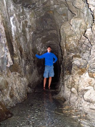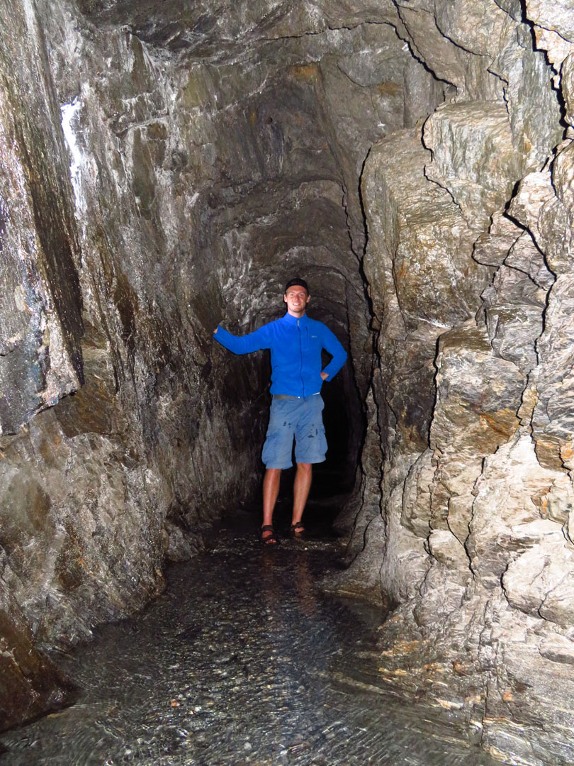 Das andere Highlight am Ort ist ein alter Goldminen-Stollen, der durch den Berg getrieben wurde, und in dem etwa knöchelhoch ziemlich kaltes Wasser steht. Will man hindurchgehen wäre es sicher angenehm, das Ganze in Gummistiefeln zu tun- oder eben in Flipflops oder Sandalen. Mit ziemlich kalten Füßen kamen wir schließlich auf der anderen Seite wieder ans Tageslicht.
