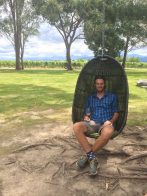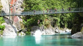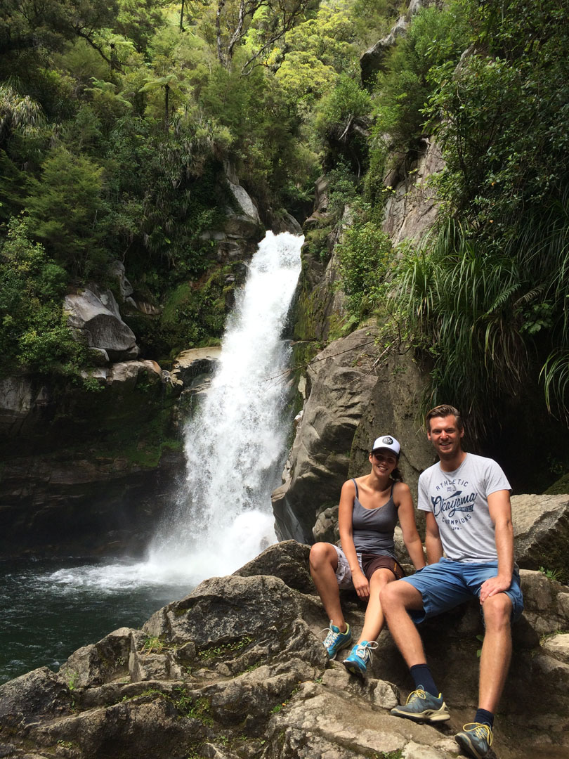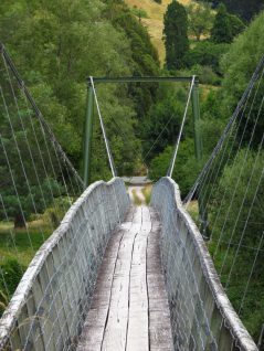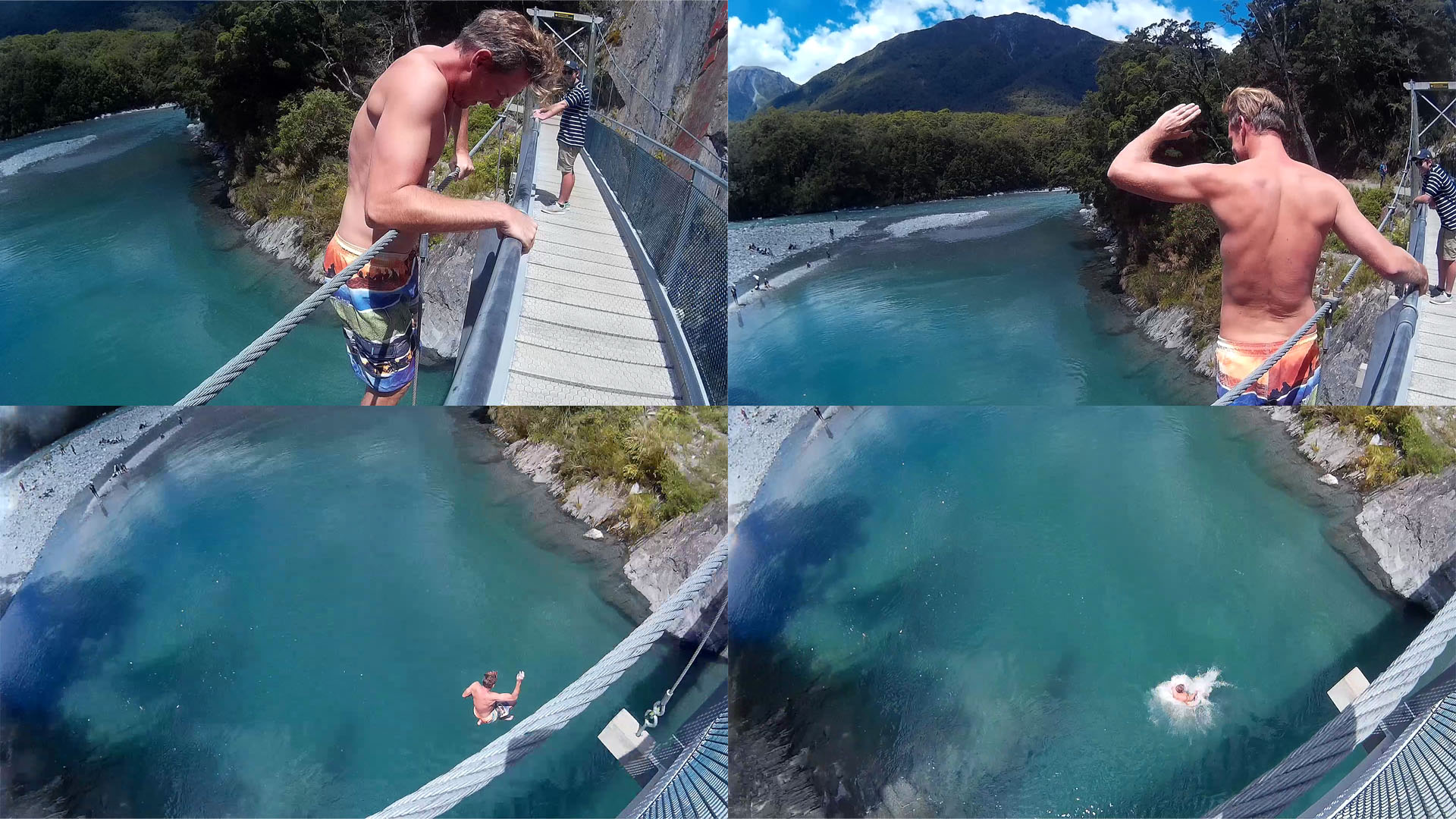 Soweit so schön, allerdings sprach sowohl der Eintrag in der Campermate App als auch die entsprechenden Kommentare davon, dass man hier super von der Brücke ins Wasser springen könnte. Das ließ uns natürlich keine Ruhe! Allerdings war die Brücke schon recht hoch… so 100%ig sicher, wie die Felsen im Flussbett verteilt waren, waren wir auch nicht, und überdies war es ja doch ganz schön frisch! Nach einer Weile des Haderns einigten wir uns darauf, es nicht zu tun. Sicher besser so… und gesünder… Stichwort Herzstillstand – soll ja alles schon vorgekommen sein…! Während wir uns grade mit unserer Argumentationskette anfreundeten sahen wir, wie ein fetter Maori in Badehose die Brücke betrat, sich ohne langes Zögern -zugegeben mäßig elegant- über die Brüstung schwang und sich wie ein nasser Sack ins Wasser fallen ließ! Fröhlich prustend tauchte er wieder auf und schwamm auf uns zu. Oha! Sollten wir vielleicht doch? Das dachten sich wohl auch drei weitere deutsche Backpacker, zwei Jungs und ein Mädel, zu unserer Rechten. Als hätten auch sie nur auf den letzten Impuls gewartet entledigten sie sich letzter T-Shirts und und Cäppis und sprangen einer nach dem anderen von der Brücke. Etwas betreten schauten Christina und ich uns an, dann zog auch ich mein T-Shirt aus- die Sache war eh längst entschieden! Ich drückte unserer Vorreiterin, die bereits wieder an Land gekommen war, meine Kamera in die Hand und auch wir betraten die Brücke. Der Weg durch die Drahtseile war etwas fummelig und so richtig gut stehen konnte man für den Absprung auch nicht. Egal – ein Gruß in die Kamera, und runter! Nach dem Eintauchen dann wie erwartet der Schock: ach du Schande ist das kalt! Aber ausgesprochen belebend! Mit schnellen Zügen schwamm ich zum Ufer- Ganzkörperbrand! Aber ein herrliches Gefühl, wenn man erst mal wieder in der wärmenden Sonne steht! Christina filmte sowohl mich, als auch ihren eigenen Sprung mit der PseuPro- hier ein paar Bilder von der Action: