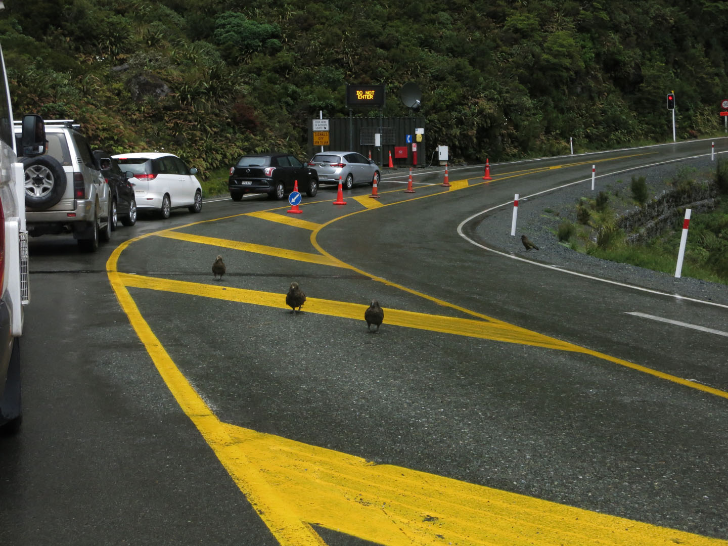 An anderer Stelle musste man an einer Ampel vor einem Tunnel warten und richtig mit System hüpften drei Keas hier von Auto zu Auto! Später auf dem Campingplatz gab es dafür dann Lamas!