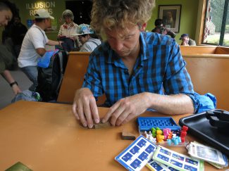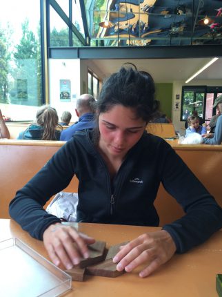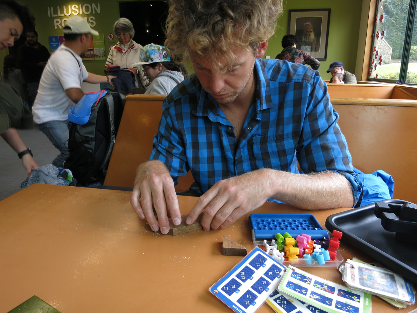 Neben einem Outdoor Labyrinth konnte man sich am Schluss noch an einer Vielzahl von Geduldsspielen versuchen, was uns mehr oder weniger gut gelang. Zuletzt saßen wir verbissen an zwei ausgesprochen schwierigen Spielen – eigentlich schon lange schrecklich hungrig, was die Sache nicht besser machte! Schließlich gaben wir auf, und ließen uns von einer der Angestellten erklären wie es funktioniert. Zumindest eines der Beiden war eine derart komplizierte Folge von wiederholt in der richtigen Reihenfolge durchzuführenden Schritten – da hätte ich noch Stunden sitzen können, ohne „das Seil zu befreien“ – immerhin ein wenig tröstlich…!