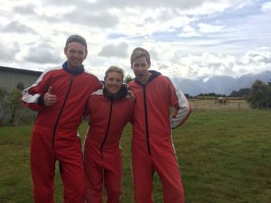 Da es in 19000 Fuß Höhe ziemlich frisch werden kann, bekamen wir einen schicken roten Overall und eine stylische Fliegerkappe gestellt. Nachdem wir fertig aufgegurtet waren trafen wir auf unseren Instructor, und schon ging es in die kleine Propellermaschine, die uns gemächlich auf die angepeilte Höhe schraubte. Da ab 15000 Fuß die Luft nicht nur kühl, sondern auch etwas dünn wird, bekamen wir für die letzten 4000ft eine Maske mit Sauerstoff aufgesetzt! Unter uns zog die Landschaft dahin, und fasziniert ließ ich das Panorama auf mich wirken: da waren die beiden Gletscher, die wir die letzten Tage besucht hatten, dort der Mt. Cook – und tatsächlich, dort auf der anderen Seite der Alpen war der Gletschersee, an dem wir kürzlich noch gestanden und die Eisberge betrachtet hatten. Ein wahrhaft atemberaubender Anblick- Sauerstoff hin oder her! Schließlich war die Zielhöhe erreicht. Ich war als letzter eingestiegen – und stieg dementsprechend als erster wieder aus. Während des Aufstiegs hatte mich mein Tandempartner fest mit sich verbunden und gemeinsam schwangen wir die Beine aus der offenen Tür. Was dann kommt, ist streng genommen unbeschreiblich! Der freie Fall, und vor allem der Beginn desselben, wenn man aus 19000 Fuß auf die Erde zu beschleunigt, bis die konstante Fallgeschwindigkeit erreicht ist, und einem die Atmosphäre wortwörtlich um die Ohren fliegt, ist der ultimative Kick! Leider macht man ja beim Tandemsprung keine Mätzchen wie Saltos oder andere Figuren, sondern wird ziemlich schnell durch einen kleinen Stabilisierungsschirm in Bauchlage gehalten. In dieser Position hatte ich nun 85 Sekunden- durchaus Zeit genug, um die tolle Landschaft zu würdigen, die da kontinuierlich auf mich zu fiel. Schließlich öffnete der Instructor den Schirm und es begann der entspannte Teil. Ich durfte sogar mal den Fallschirm steuern: „Zieh mal so feste wie du kannst!“ – gesagt getan, und wir schraubten uns zügig mal rechts- mal linksrum Richtung Dropzone, wo die Landung in der Tat fußschonend auf dem Hintern erfolgte! Was für ein Erlebnis! Trotz des stolzen Preises von über 500 NZD hat es sich auf jeden Fall gelohnt, allerdings habe ich diesmal auf sämtliche Foto- oder Videodokumentation verzichtet, um das Budget nicht überzustrapazieren. Ein Beweisfoto von nach dem Sprung gibt’s aber trotzdem!