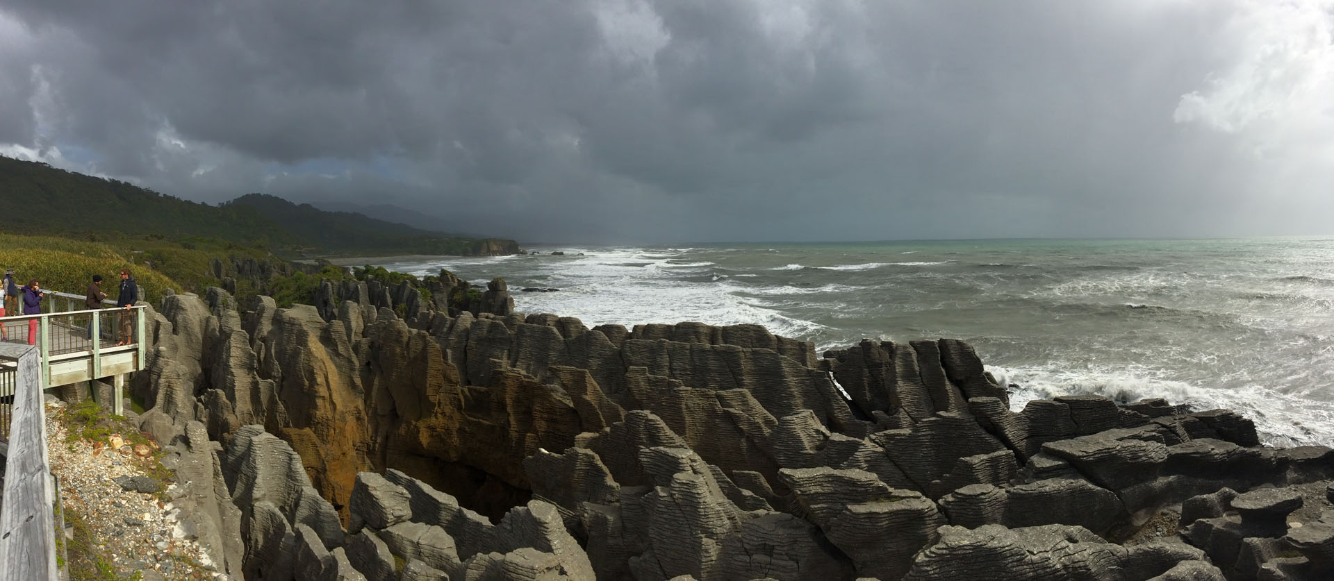 Ein paar Lookouts, Forest Walks und schroffe Küstenabschnitte später war das nächste Highlight auf unserem Weg die Pancake Rocks. Diese eigentümliche Felsformation weist eine markante Querschichtung auf, über deren Herkunft man wohl uneins ist. Egal- auf den Fotos sieht es hübsch aus!