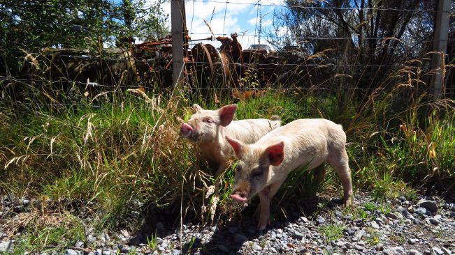 Als wir von Wellington aufbrachen herrschte bestes Wetter, und auf dem Weg nach Norden schauten wir kurz bei einem ziemlich großen Autofriedhof vorbei, auf dem teilweise sehr alte Autos vor sich hinrosteten, und irgendwie ein hübsches Fotomotiv abgaben- und während wir so vor uns hin knipsten tauchten plötzlich diese kleinen Schweinchen auf: