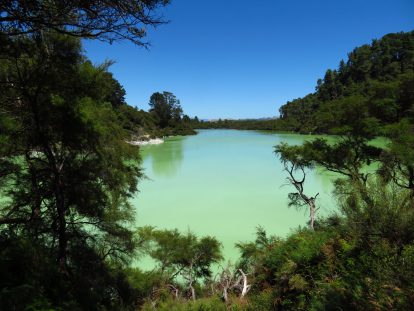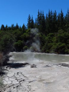 Das sicherlich spektakulärste, was wir in Sachen Erdwärme zu sehen bekamen, war das „Geothermal Wonderland“ bei Weiotapu. Hier dampfte und blubberte es, es gab gelbe Seen, grüne Tümpel und rote Erde, und über allem lag der unverkennbare Geruch nach Schwefelwasserstoff, der einen im Übrigen bis auf den Campingplatz verfolgte, dort allerdings dankenswerterweise in abgeschwächter Form.