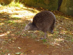 In all den Wochen (und in Christinas Fall Monaten) war es keinem von uns gelungen, einmal das Tier zu sehen, das den Neuseeländern ihren Namen gibt: den Kiwi. Dieser etwas unförmige, flugunfähige Vogel konnte sich seinerzeit ohne natürliche Feinde in Neuseeland entwickeln und verbreiten, ist aber seit der Ankunft der ersten Menschen, und vor allem durch Hunde und Katzen ziemlich bedroht! Er lebt im dichten Unterholz und ist nachtaktiv, daher ist eine zufällige Begegnung eher unwahrscheinlich! Bei Whangarei gab es jedoch ein „Rescue Center“ für verletzte oder verstoßene Vögel und hier konnten wir den Kiwi nicht nur sehen, sondern sogar auch streicheln! Neben einigen Vögeln, die hier vorübergehend aufgepäppelt werden, gibt es nämlich auch einen Dauerbewohner: den einbeinigen Kiwi Sparky, der als Küken ein Bein in einer Falle verloren hat. Robert, der leidenschaftliche Leiter der Einrichtung, hatte jedoch noch eine besondere Überraschung für uns: Für ein paar Tage hatte er einen Baby-Kiwi in seiner Obhut, bevor dieser wieder ausgesetzt würde, und da wir in dem Moment die einzigen Besucher waren, zeigte er ihn uns. Goldig- wir durften auch diesen streicheln und zogen hochzufrieden, und mit zahlreichen Kiwi-Fotos im Gepäck schließlich weiter:
