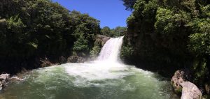 Die Gegend um Roturua ist besonders bekannt für ihre heißen Quellen und geothermalen Aktivitäten. Über Bookme hatten wir uns einen super Deal für ein ansonsten ziemlich überteuertes Thermal-Schwimmbad geschossen. Unterhalb von einigen Kalkweißen Terrassen, über die siedend heißes Wasser floss waren drei unterschiedlich heiße, ebenfalls Terrassenförmige Becken angelegt. Je nach Bedarf wurde mal etwas heißes Wasser von den Terrassen nachgelassen und die Becken waren so angenehm warm und nett angelegt, dass wir gar nicht mehr raus wollten, und schließlich zum Ende der Öffnungszeiten rausgekehrt wurden. Gar nicht weit davon gab es einen Staudamm, mit einem schmalen Bächlein, dass weiter unterhalb durch eine kleine Schlucht floss. An sich nicht sonderlich spektakulär, doch wenn man zur richtigen Tageszeit da war, bekam man mit, wie die Tore am Damm ein Stück weit geöffnet wurden, und sich das Rinnsal in einen reißenden Fluss verwandelte: