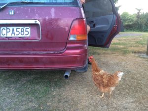 Am anderen Morgen wurden wir durch ein merkwürdiges Klopfen am Auto geweckt. Nicht sehr laut, aber es klopfte immer wieder! Ein Blick durch die Fenster- es war nichts zu sehen, doch es klopfte weiter. Dann mussten wir also doch mal aussteigen und nachgucken- und siehe da: es war ein vorwitziges Huhn, was Gefallen daran gefunden hatte, gegen unsere Stoßstange zu picken!