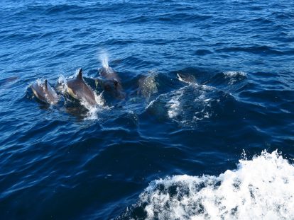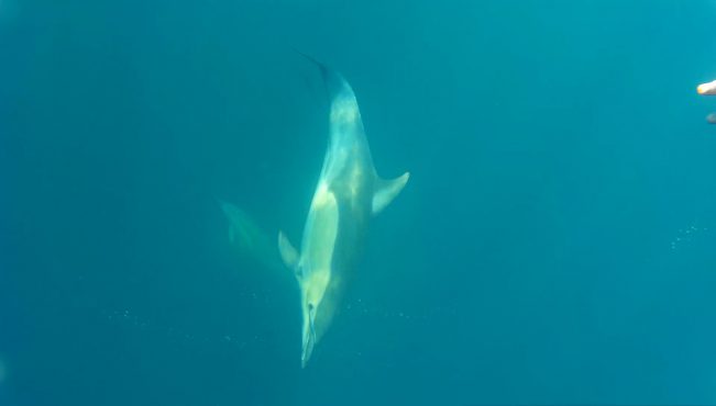 Früh am nächsten Morgen ging es los, und wir verbrachten einen wunderbar sonnigen Tag auf dem Wasser. Bald spielten die Delphine dicht um den Bug des Schiffes und wir konnten uns – ausgestattet mit Neoprenanzug gegen die Kälte – in Gruppen an Auslegern rechts und links am Schiff durch das Wasser ziehen lassen, während der Käpt’n den Delphinschwarm verfolgte. Auch wenn die Tiere oft gut zu sehen waren, so richtig dicht kamen sie dann doch nicht- möglicherweise hatte ich mir das etwas anders vorgestellt, aber es war auch so wirklich schön, und ein besonderes Erlebnis!