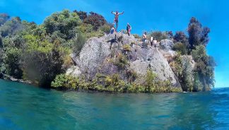 Dank unserer Campermate App wussten wir, dass es irgendwo an der Straße eine Stelle zum Klippenspringen geben sollte, an der man sonst sicher vorbeigefahren wäre. So aber standen wir bald darauf mit ein paar Locals auf den bestimmt 5-6 Meter hohen Felsen und sprangen in den See. Das Wasser war herrlich- frisch, aber nicht zu kalt, blau und klar. Immer wieder kletterten wir zurück auf den Felsen, bis wir schließlich genug hatten, und hungrig nach Taupo rein fuhren.