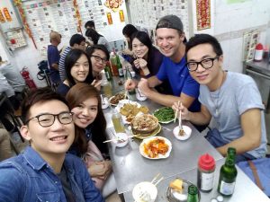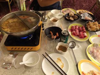 Dann besuchten wir ein Restaurant, das spezialisiert war auf ein ziemlich traditionelles Gericht: den Hotpot! Man kann sagen, das ist die Hongkong-Variante von Fondue! In einem zweigeteilten Topf auf dem Tisch köchelte Brühe und Satay-Suppe vor sich hin, und man konnte aus einem breiten Spektrum an Dingen wählen, die man da dann zum Garen reinwarf. Nur mit Mühe konnte ich Desmond daran hindern „Testicles“ – also Hoden (…von welchem Tier auch immer) – zu bestellen… Beim Hühnerdarm habe ich mich allerdings reinlegen lassen… Alles in allem war es aber ein äußerst schmackhaftes Essen – und ein sehr authentisches Erlebnis, denn ein Blick in die Runde zeigte schnell- außer mir hatte sich kein anderer Weißer hierhin verirrt!
