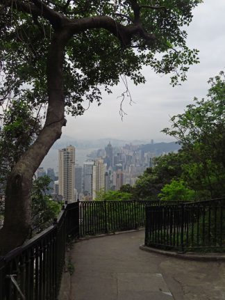 Da mein Entschluss, Ko Phangan gleichsam fluchtartig zu verlassen ja durchaus etwas kurzfristig gefasst war, konnte ich auch Desmond nur knapp vorher informieren. Zum Glück hatte er aber sowieso das Wochenende frei, und begann sogleich einen Plan für meinen Besuch auszuarbeiten. An meinem ersten Tag, einem Freitag, ließ ich mich aber erst mal ein wenig durch das Viertel treiben, aß als einziger Weißer in einem kleinen Lokal zu Mittag und besichtigte die erste Pflichtattraktion, den „Peak“. Von diesem Berg, an dessen Hängen die Reichen und Schönen wohnen, hat man einen tollen Blick über die Stadt, den Victoria Harbour und Mongkok auf der anderen Seite des Wassers. Leider war es ziemlich diesig- schön war es trotzdem!