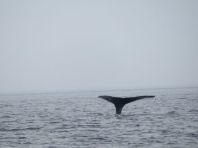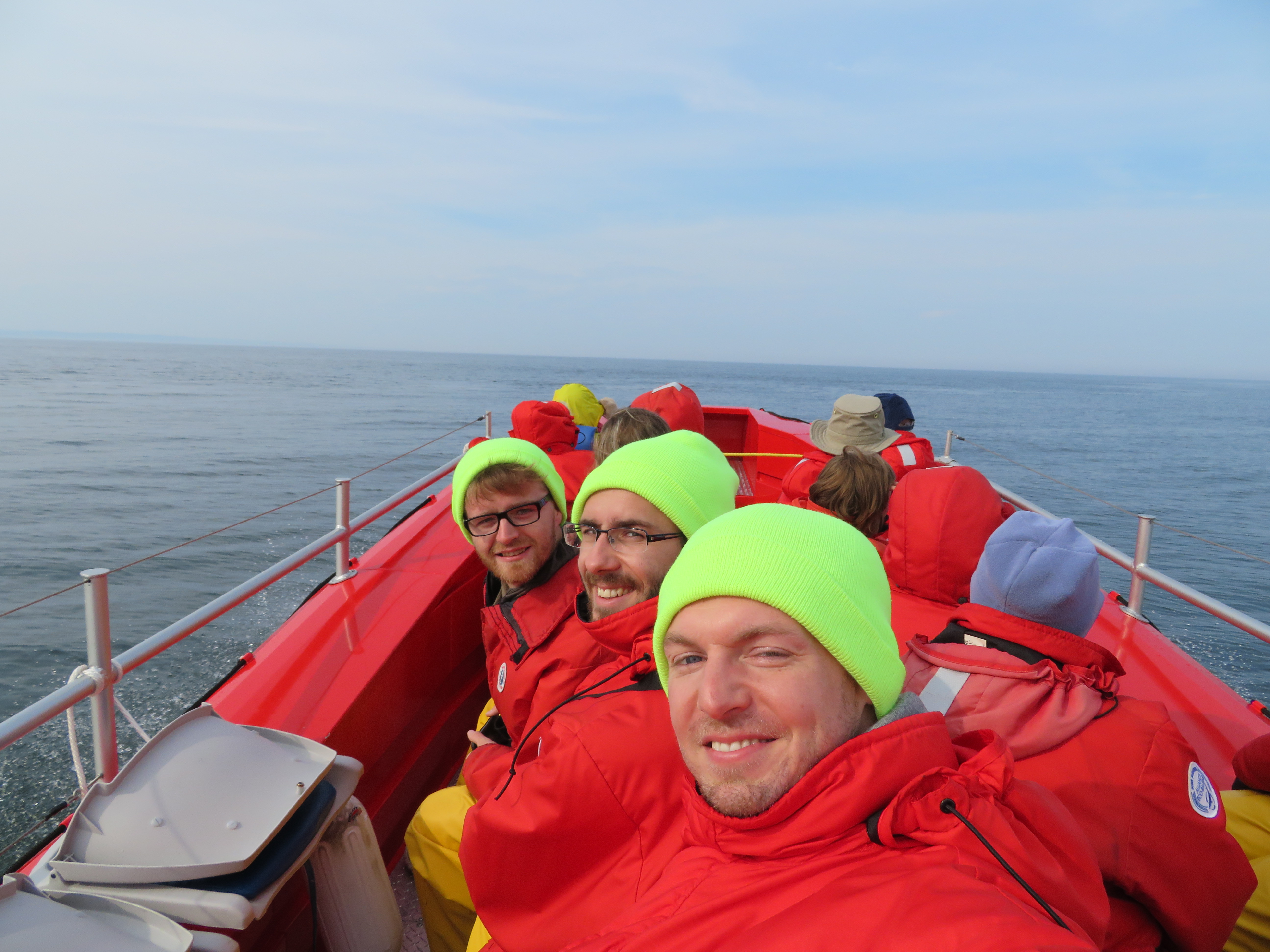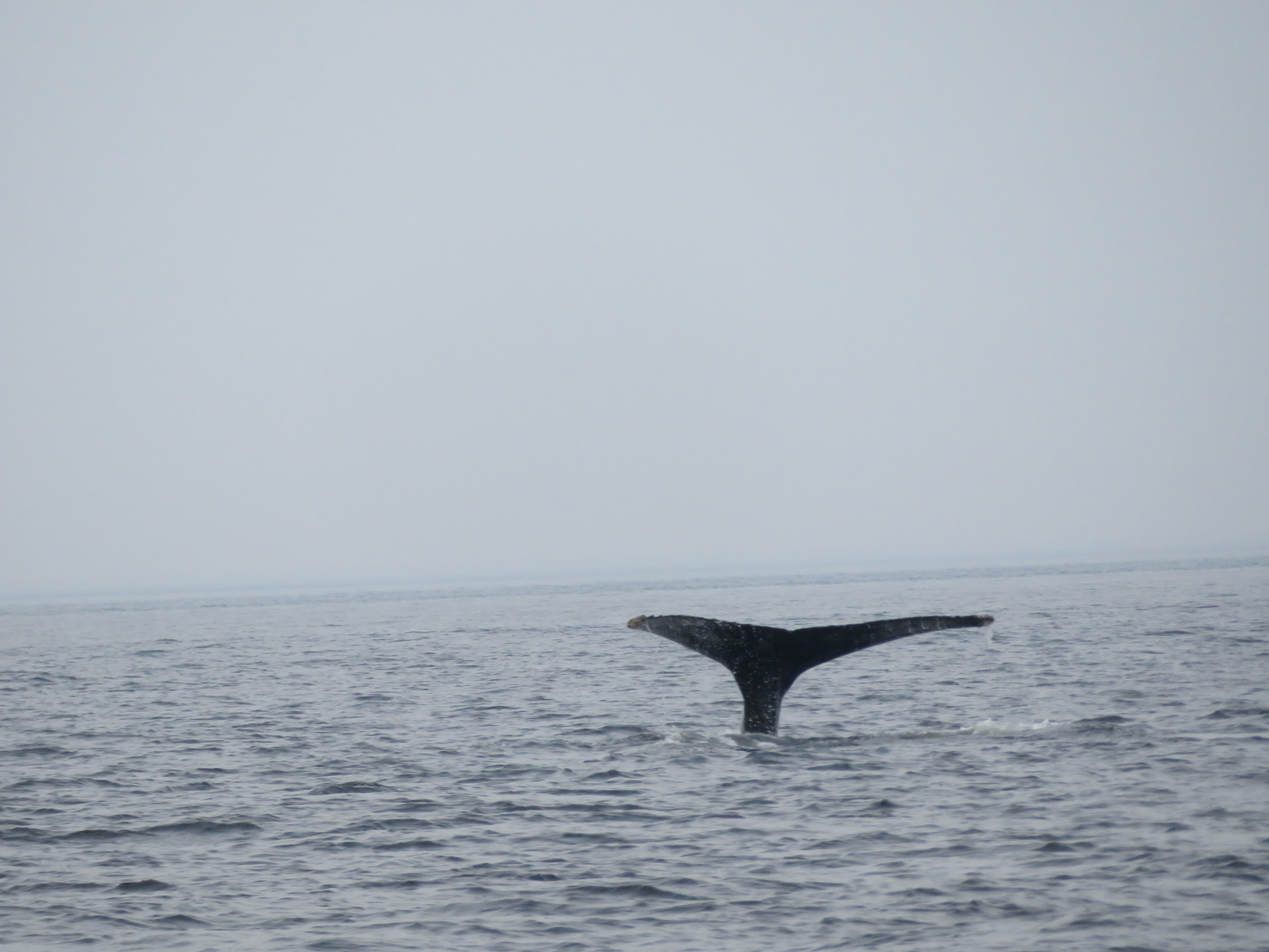 Auf die Wale mussten wir etwas länger warten. Dick eingepackt in Ölhose und warmem Parka führen wir in einer Art großem Schlauchboot mit rund zwanzig Leuten auf den St Lorenz Strom hinaus. Der zunächst an bestimmter Stelle vermutete Blauwal zeigte sich nicht. Ab und zu ein paar Delphine – aber wegen denen waren wir schließlich nicht hier! Nach einer halben Stunde erfolglosem Kreuzen entschied der Kapitän die Suche an anderer Stelle – mit anderen Walen- fortzusetzen. Und tatsächlich: mit wiederum etwas Geduld sahen wir schließlich zwei Buckelwale, die stilecht Luft durchs Atemloch ausbliesen und zum Abtauchen brav die Schwanzflosse zeigten. Einer schwamm auch mal direkt auf das Boot zu und tauchte drunter her. Nach insgesamt ca. zwei Stunden Bootsfahrt ging es dann wieder an Land. Auch wenn ich mir etwas mehr netto Wal-Zeit und vielleicht den ein oder anderen Sprung erhofft hätte, das war schon ne schöne Aktion!