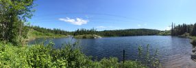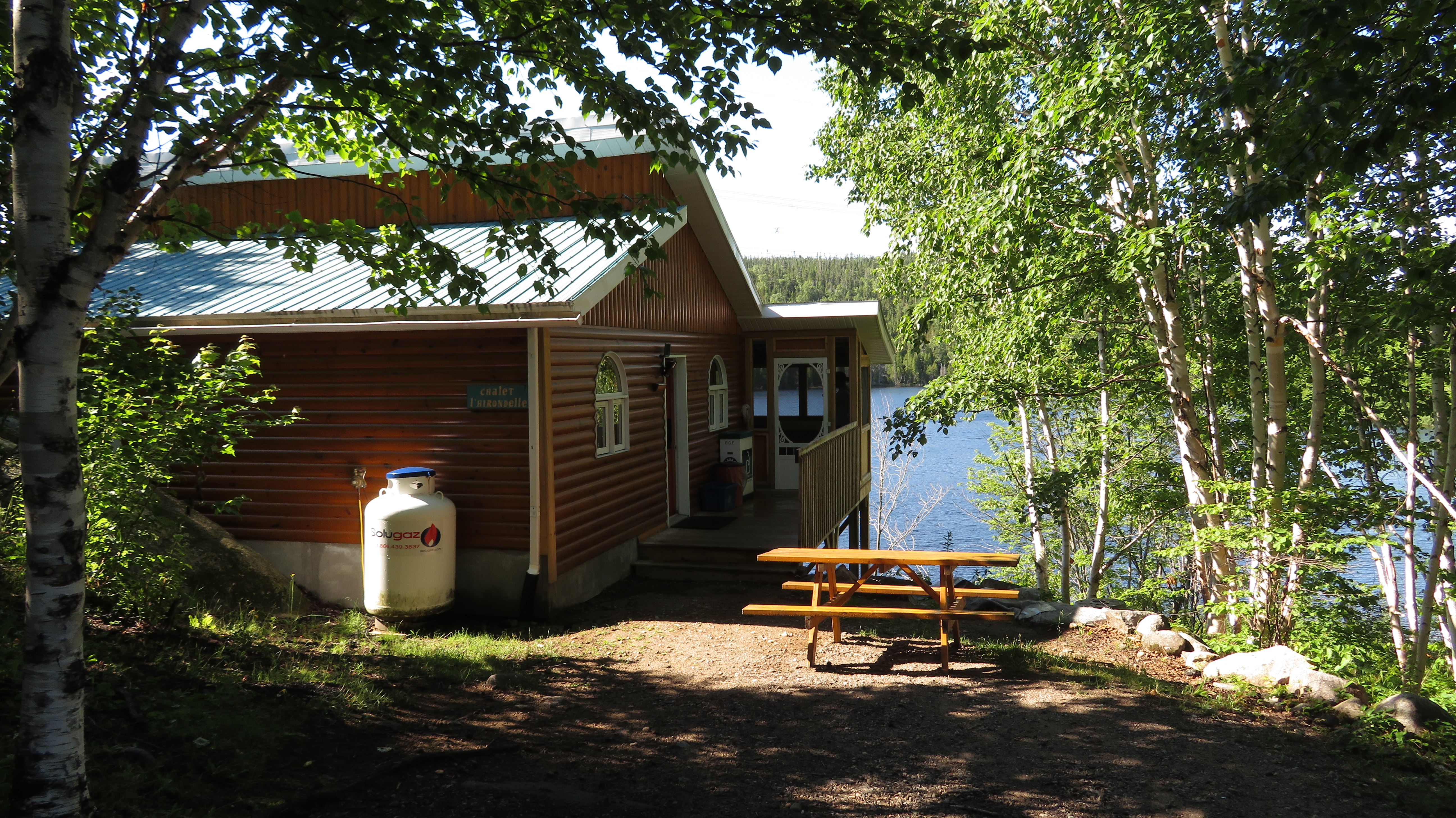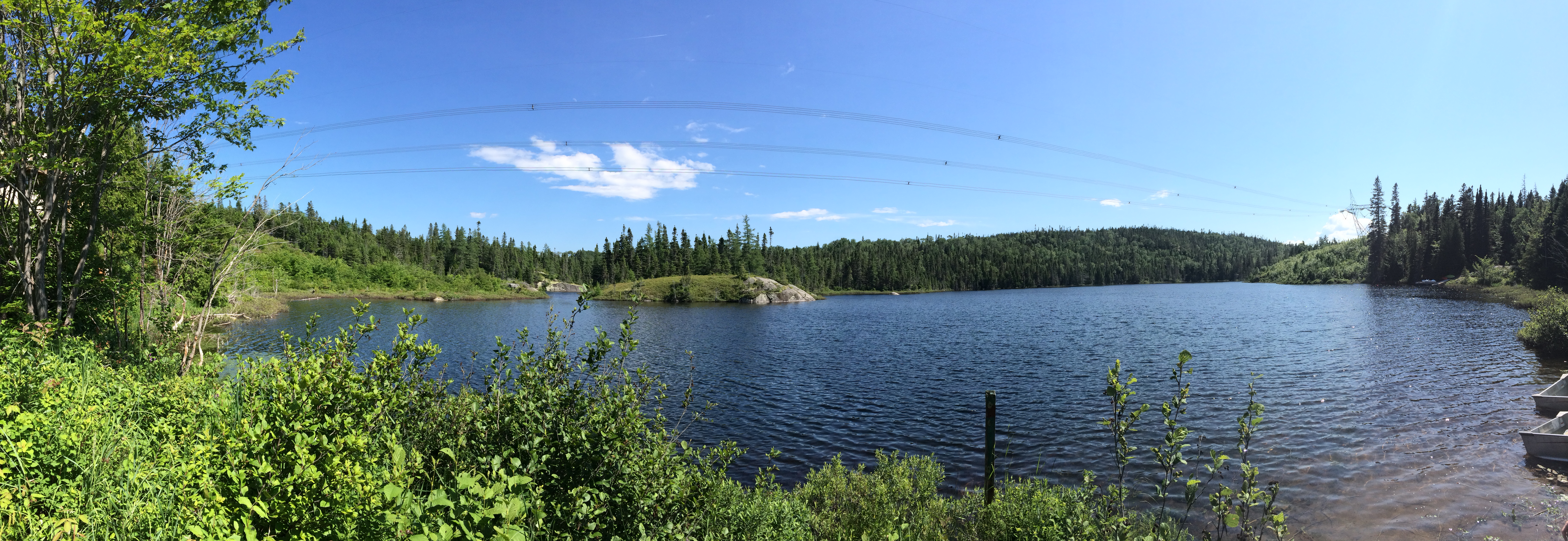 Um dem Regen zu entfliehen besuchten wir auch die „Cité de l’Énergie“ bei Shawinigan, ein gut gemachtes Museum rund um die in Québec sehr wichtige Energiegewinnung aus Wasserkraft. Tags drauf ging es dann nach Tadoussac, zur Hütte am „Lac à Jimmy“. Das für 12 Personen ausgelegte Chalet hatten wir im Endeffekt komplett für uns allein, was durchaus angenehm war! Jeder hatte sein eigenes Zimmer, alles war aus Holz und es gab weder Strom noch Handynetz. Über eine Solarzelle wurde tagsüber eine Batterie aufgeladen mit der man abends zumindest ein paar Lichter anmachen konnte, warmes Wasser und der (typisch amerikanisch) überdimensionierte Kühlschrank wurden –wie der Herd- mit Gas betrieben. Direkt am Wasser gelegen und am Hang gebaut überblickt der große Balkon des Chalets den kleinen See und die Wälder und das ganze könnte unfassbar naturbelassen sein, würde das Panorama nicht durch die Starkstromleitung getrübt, die sich quer über den See spannt und ein dezentes Brutzeln von sich gibt. Was solls- Opfer wollen gebracht werden! Ein weiteres wäre wohl, dass es in dem See anscheinend Blutegel geben soll… ist aber kein Problem, man darf halt nicht vom Ufer reingehen, aber vom Boot aus schwimmen: kein Problem! War es auch nicht! Trotz Stromleitung war das ganze auf jeden Fall schon mal ein bisschen Natur-pur! Sauberes Wasser, nirgendwo Plastiktüten oder Coladosen, wir haben Bieber und deren Dämme gesehen, lustige Kanutouren auf dem See unternommen und die Felsen am Ufer erklettert. Ansonsten wurde die Zeit ausgedehnt mit nichtstun und lesen  durchgebracht, was für mich anscheinend der angemessene Zeitpunkt war, die willkommen-im-Urlaub-Erkältung zu starten…