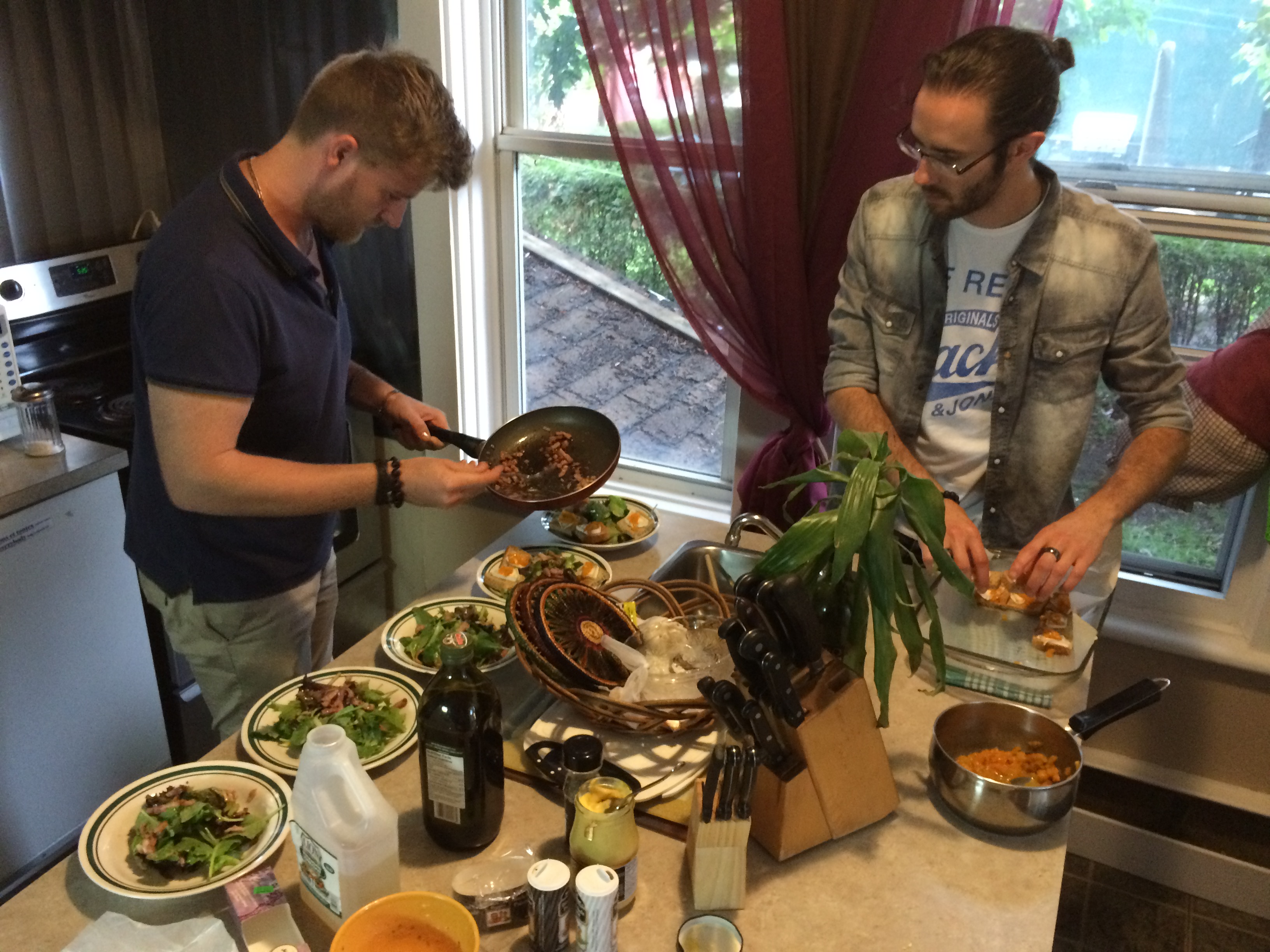 In unserer Hütte am See waren wir Selbstversorger, was keineswegs bedeutet, dass es jeden Abend Nudeln mit Soße gab… im Gegenteil! Was sich in Trois-Rivières im Hostel schon andeutete setzte sich hier gradewegs fort: meine beiden Franzosen waren Freunde der guten Küche und des Savoir-vivre! Da wurde mit einer Lässigkeit mal dies mal jenes gezaubert und auch aus den Resten nochmal gut gegessen. Zunächst führte ich das beeindruckt auf die französische Lebensart zurück, bis ich erfuhr, dass Franck gelernter Koch ist…! Ha! Man muss nur die richtigen Leute kennen! Arnaud, der Konditor, hat sich jedoch mit wortreichen Ausflüchten über Liegezeit und Zubereitungsbedingungen von Blätterteig aus der Affäre gezogen, als es um frische Croissants zum Frühstück ging… sei’s drum.