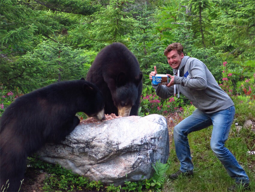 … vielleicht saßen wir aber auch in einem Bretterverschlag mit bestenfalls psychologisch wirksamem Elektrozaun drumherum und beobachteten, wie sich die Bären in 50 m Entfernung über große Mengen Kuchen hermachten.  Alles irgendwie gar nicht so weit weg von unserer Hütte… die Viecher laufen hier halt frei herum. Auch wenn man als Mensch für den Schwarzbären (anders als für den Grizzly) nicht ins Beuteschema fällt, ist eine Begegnung ohne Elektrozaun und Ranger mit Gewehr wohl eher zu vermeiden…