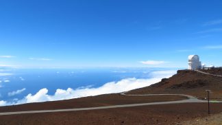Wiederum zu früher Stunde machten wir uns diesmal also auf den Weg: ein deutsches Pärchen auf Backpacker-Flitterwochen, zwei Kanadier und ich. Martin aus Québec hatte das Auto gemietet und fuhr, während wir im Halbschlaf die dunkle Landschaft an uns vorbeiziehen ließen. Amerikanisch-praktisch kann man von Meereshöhe bis auf den 3058m hohen Gipfel mit dem Auto fahren. Unverhofft verschaffte uns mein Nationalpark Jahrespass, den ich mir für die Parks in Kalifornien, Arizona und Utah besorgt hatte, auch Zutritt zum Haleakala Nationalpark, was mich mit einem Gefühl tiefer Zufriedenheit erfüllte. Grade rechtzeitig zum Beginn der Show saßen wir schließlich auf den Felsen und betrachteten andächtig den Himmel, wie übrigens zahllose weitere Touristen ebenfalls, denn es handelt sich hier keineswegs um eine Geheimtipp-Aktivität. Schweigend ein paar Kekse knabbernd sahen wir zu, wie sich der Horizont rot-orange Färbte und die Sonne schließlich aufging und auch die Nachbarinseln in morgendliches Licht tauchte.