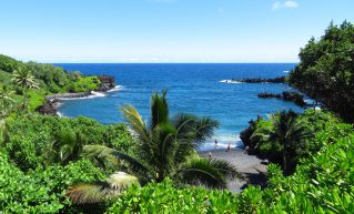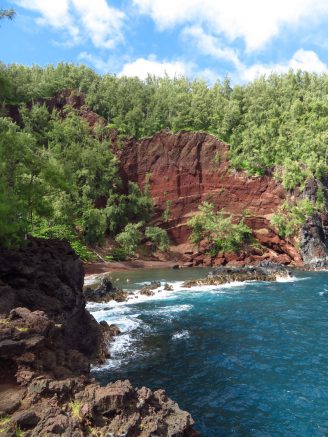 Ein weiteres Highlight auf Maui ist die „Road to Hana“. Hierfür bot das Hostel eine Tour mit dem Van an und wir haben uns in einer netten Gruppe einige der Sehenswürdigkeiten unterwegs angesehen, denn bei dieser Straße gilt: der Weg ist das Ziel! Schwarze und rote Strände, dichter Regenwald und Schwimmen im Wasserfall – leider konnten wir nicht überall halten, denn es hätte noch viel mehr zu sehen gegeben. Zum Abschluss des Tages wollten wir noch den Sonnenuntergang sehen, da wir allerdings etwas im Verzug waren bretterte unser Guide was das Zeug hielt weiter um den Haleakala herum, bis wir freie Sicht auf die Sonne hatten. Der Sonnenuntergang war schon im Gange und wir verließen zügig das Auto um noch was mitzukriegen. Leider habe ich meine Kamera in dem Moment nicht mitgenommen, denn tatsächlich sah ich ihn hier- das erste und bisher auch einzige Mal: den „Green Flash“. Bei diesem physikalischen Phänomen sieht man ganz kurz nachdem die Sonne untergegangen ist noch ein dezentes grünes Leuchten- nur für den Bruchteil einer Sekunde. Keineswegs so eindrücklich wie im „Fluch der Karibik“, aber es existiert wirklich- wenn die Bedingungen stimmen, so muss der Horizont wolkenfrei und scharf begrenzt sein, denn das was man sieht ist der grüne Anteil, des in der Atmosphäre gebrochenen Lichtes, der etwas über der orangenen Sonnenscheibe hängt und kurze Zeit nach dieser hinter dem Meer verschwindet.