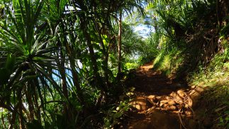 Am nächsten Tag fuhren wir von der anderen Seite an die Napali Coast heran, denn wir wollten ein Stück des Wanderweges machen, der vom Parkplatz des Ke’e Beaches im Norden der Insel beginnt, und Richtung Südwesten bis ins Kalalau Valley führt. Das wäre allerdings eine mehrtägige Wanderung, die überdies auch nicht ganz ungefährlich ist, da der Weg gegen Ende nur noch ein schmaler Schotterpfad am Hang oberhalb der Klippen ist. Daher begnügten wir uns mit der ersten Etappe und wanderten bis zum Hanakapi’ai Beach. Die Unternehmung begann äußerst glücklich: auf dem lächerlich unterdimensionierten, hart umkämpften Parkplatz waren Julia und ich zur rechten Zeit am rechten Ort und ergatterten einen Platz unmittelbar neben dem Einstieg zum Wanderweg. Nachdem wir uns durch einen beeindruckenden Schilderwald erst mal lückenlos über die zu erwartenden Gefahren und die angeratenen Proviantmengen in Kenntnis setzen ließen, ging es zunächst einmal bergauf! Der Großteil des Weges führt in einiger Höhe am Hang entlang und bietet traumhafte Ausblicke über die Küste, allerdings wollen die erst mal erarbeitet werden. Doch das hat sich gelohnt! Hinter jeder Kurve wartete eine etwas andere Perspektive auf diese beeindruckende Steilküste.