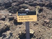 Das Highlight aber spielte sich unten an der Küste ab. Mit dem Auto fuhren wir durch ein weites Lavafeld bis runter an die Steilküste, um von dort einen strammen Fußmarsch zu der Stelle zu unternehmen, wo die Lava ins Meer floss. Hier waren wiederum einige warnende Schilder, die leider diesmal nur allzu recht behalten sollten. Wassertechnisch waren wir suboptimal ausgerüstet, das war allerdings nicht mehr zu ändern. Zwar akzeptiere ich als adäquates Reisewetter in der Regel nichts außer strahlend blauem Himmel, unter den Bedingungen, dass wir nun zweieinhalb Stunden durch ein schwarzes Lavafeld wandern würden, war ich jedoch nicht traurig darüber, dass es bedeckt war.